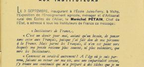 L’école doit donc être reprise en main. D’une part, il faut en faire un instrument de la « rénovation nationale » qui doit conduire à la renaissance de la France ; d’autre part, elle doit être épurée des éléments hostiles à ce projet. Cet aspect de la politique scolaire de Vichy a été présenté dans un autre chapitre. Dans ce chapitre, nous présentons quelques documents qui montrent comment Vichy s’efforce de diffuser sa propagande dans les écoles.