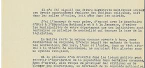 C’est dans ce contexte que se pose la question du rétablissement dans les écoles des crucifix qui en avaient été retirés (en principe) suite aux lois Ferry. Au printemps 1941, dans de nombreuses communes, les conseils municipaux décident de replacer des crucifix dans les salles de classe et/ou dans les mairies. Darlan y est d’abord hostile mais doit modérer son opposition devant l’ampleur du phénomène. En juillet 41, il opte pour une position qu’il veut consensuelle : les communes peuvent rétablir le crucifix à condition que cette décision soit le fruit d’une opinion majoritaire. La politique de Vichy en la matière est donc hésitante, par crainte de rallumer la guerre scolaire. Les documents présentés dans ce chapitre mettent en évidence ces hésitations et ces prudences.