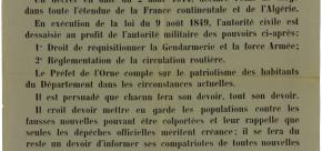 Dans les communes ornaises, le tocsin retentit et les maires reçoivent la lourde charge d’appeler leurs administrés à se préparer au conflit. Des affiches appelant à la mobilisation, déposées dans les bureaux des PTT le samedi 1er août, fleurissent sur les murs des mairies le dimanche 2 août 1914. Les hommes appartenant aux classes mobilisables sont appelés à rejoindre les lieux de casernement afin de se préparer à monter au front.