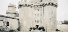 En pleine guerre de Cent Ans, le comte Jean Ier (1404-1415) fait édifier de nouvelles défenses enfermant la basse-cour : un châtelet d’entrée à tours jumelles, flanqué symétriquement d’une courtine à l’extrémité de laquelle s’élève une tour. À l’ouest, la tour Couronnée est conservée. Une courtine percée d’une poterne ouvrant sur le parc la reliait à l’enceinte du donjon. La tour du Chevalier, à l’est, a été détruite au XVIIIe siècle. L’aménagement de la prison dans le châtelet au début du XIXe siècle a entraîné la disparition du pont-levis et des portes piétonne et charretière et la destruction d’une tourelle d’escalier sur la façade intérieure.