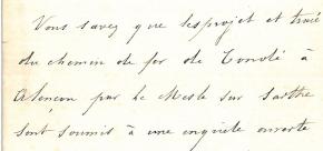 Les grandes lignes du réseau de l’Ouest sont tracées dès les années 1840. Deux lignes sont prévues en 1842 : l’une vers Rouen, pour ouvrir sur la Manche, terminée en 1843, l’autre vers Nantes, pour l’Atlantique, achevée en 1851. La Basse-Normandie et la Bretagne restent ainsi à l’écart. Pour remédier à cette situation, le principe d’une ligne Paris-Rennes est adopté en 1844. Reste à déterminer si, sur la portion entre Chartres et Laval, la ligne doit passer par Le Mans ou par Alençon. Une vive concurrence s’engage alors entre les deux villes : des deux côtés, les réseaux d’influence à Paris sont mobilisés. Mais c’est la candidature du Mans, soutenue par Guizot, qui l’emporte en 1846. En compensation, Alençon reçoit la promesse de la création d’une ligne transversale Caen-Le Mans.