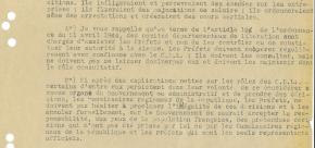 La Libération apporte évidemment un immense soulagement mais aussi de grands espoirs de renouveau. Or, les difficultés économiques et, plus généralement, les réalités sociales et politiques ne tardent pas à faire surface et à décevoir ces attentes. Par ailleurs, entre la dislocation des autorités de Vichy et le rétablissement effectif de la République se passent quelques semaines au cours desquelles des tensions s’expriment entre le pouvoir central du GPRF et les pouvoirs locaux issus de la Résistance intérieure. Les documents présentés ici permettent d’évoquer ces tensions et frustrations qui traversent la société ornaise (et française) dans les mois qui suivent la Libération.