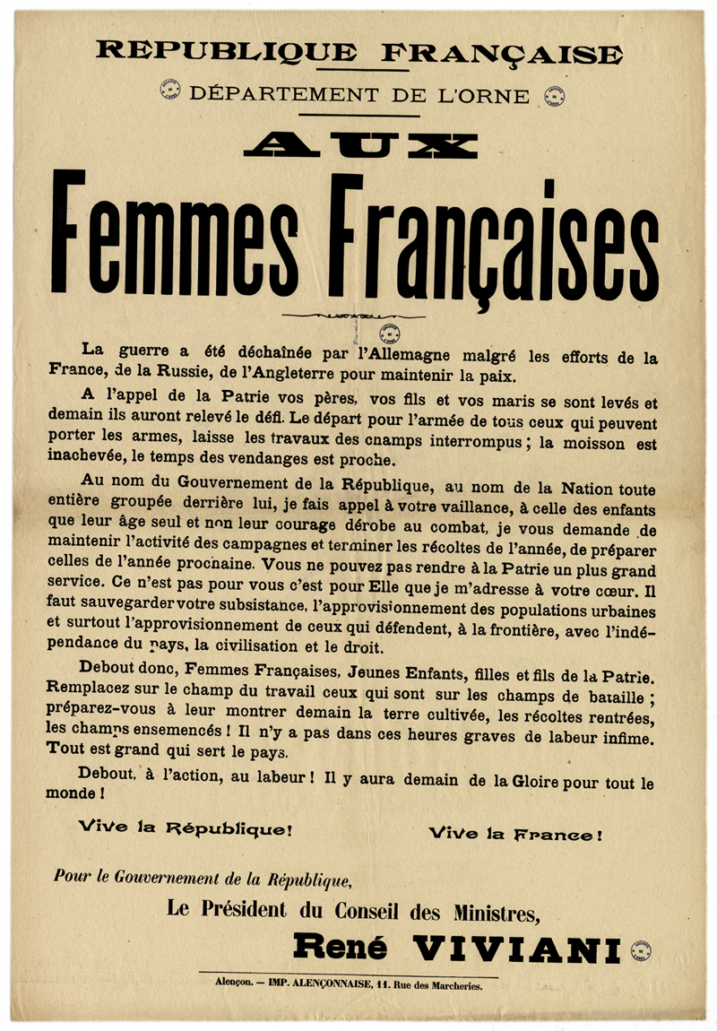 Affiche du président du Conseil René Viviani appelant les femmes à soutenir l'effort de la Défense nationale