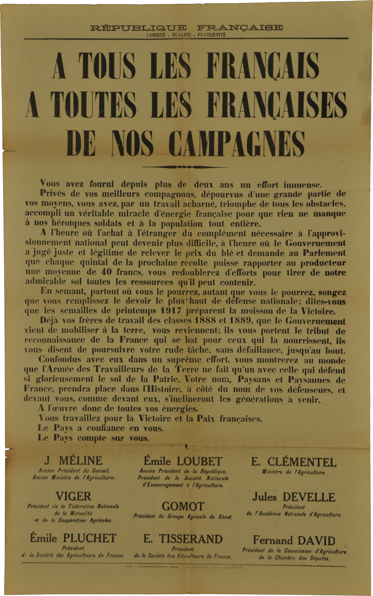 Affiche gouvernementale appelant les campagnes à soutenir l'effort de guerre
