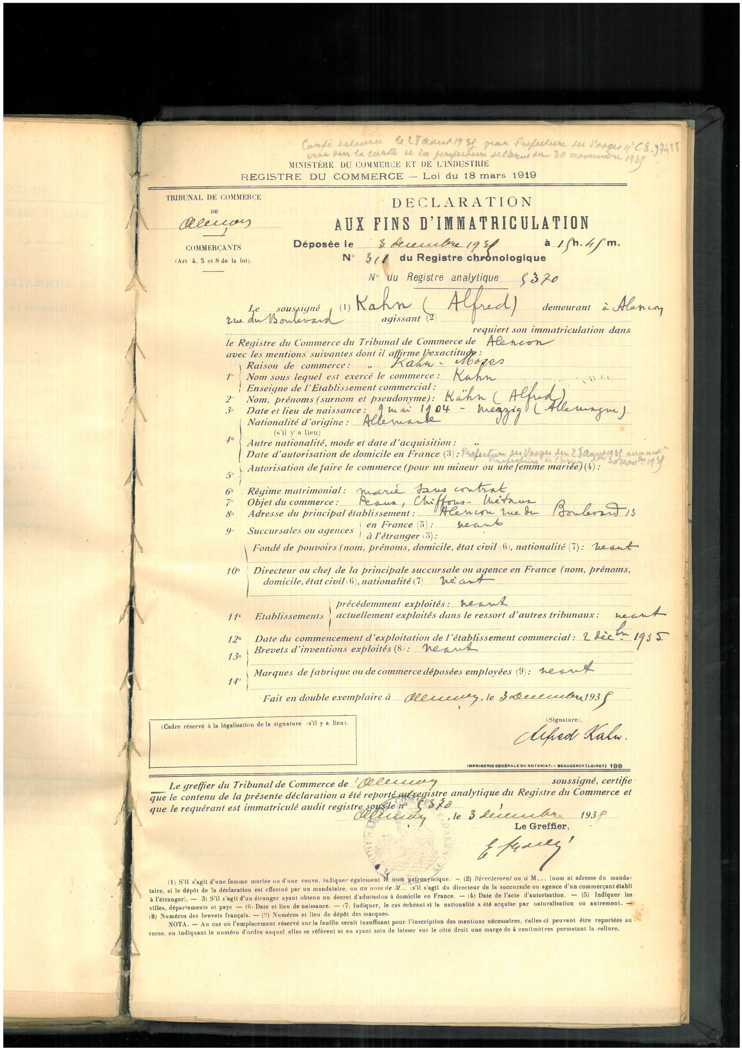 En août 1935, une partie de la famille Kahn quitte la Sarre pour se réfugier en France, à Neufchâteau (Vosges). Les réfugiés sarrois ont le droit d'emporter leurs meubles mais il n'empêche : les Kahn, comme les autres réfugiés, abandonnent en Sarre une partie de leur vie. A Merzig, Alfred, le fils aîné et Edgard, son cadet, avaient un commerce de brocante et récupération. Arrivé à Neufchâteau, Alfred ne perd pas de temps. Comme les étrangers n'ont pas le droit de résider dans un département frontalier, il cherche à s'installer ailleurs. Dans un journal professionnel, Le Chiffonnier, il apprend qu'un fonds de commerce est à vendre à Alençon. Il s'agit d'un magasin de peaux, chiffons et métaux. Avec Rosa, son épouse, il arrive dans l'Orne le 27 octobre 1935. L'affaire est vite conclue et le 3 décembre 1935, Alfred fait enregistrer sa déclaration sur le registre du Commerce. C'est le document présenté ici.