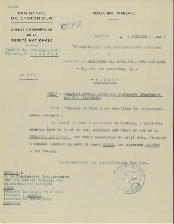 Ce courrier des Renseignements généraux rapporte un fait divers banal, comme il s’en produira tant dans l’après guerre : un enfant tué, un autre blessé en manipulant un obus. Il faudra longtemps pour nettoyer le territoire des munitions non explosées.