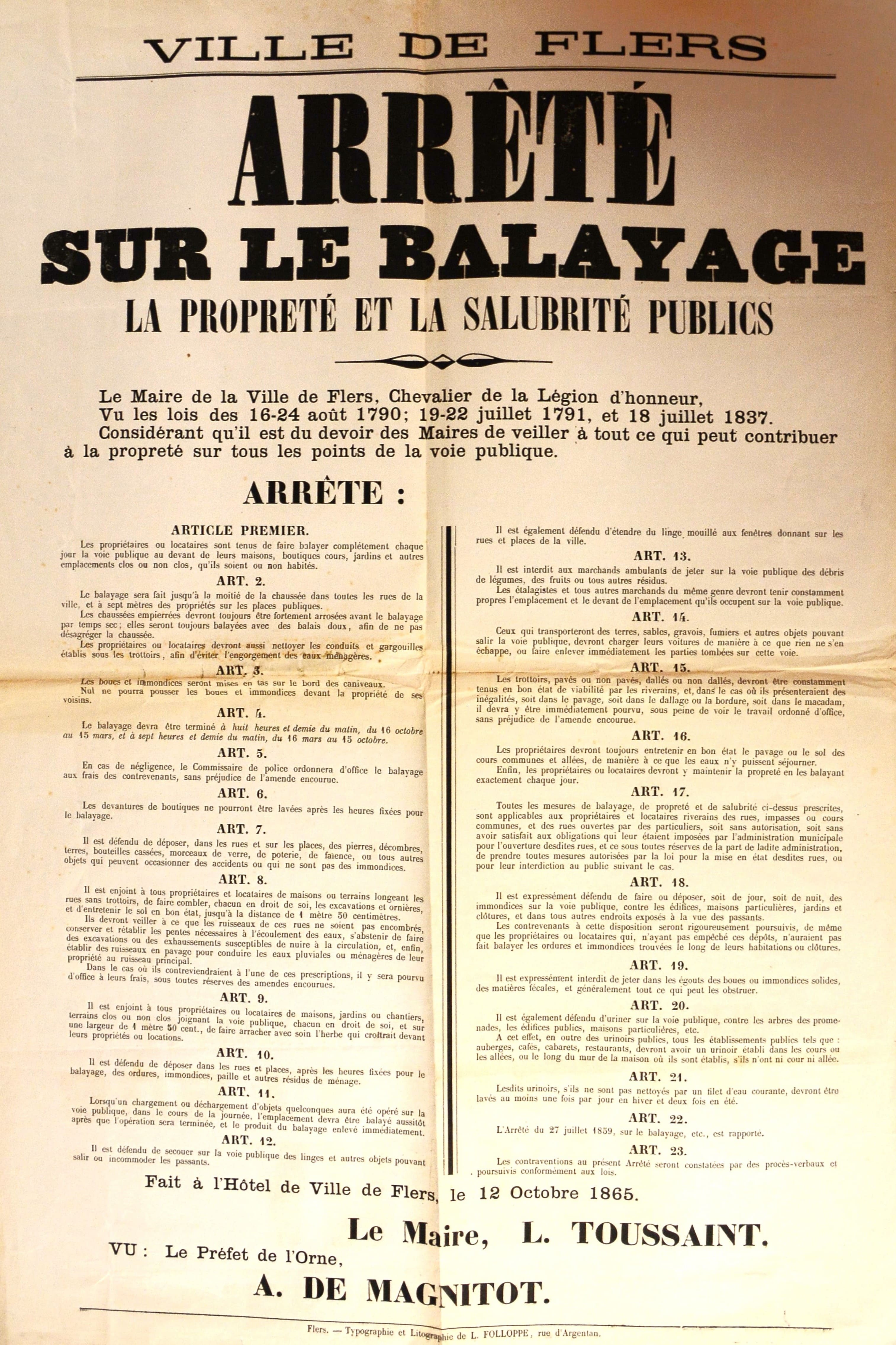 L’arrêté flérien illustre ainsi un aspect de l’urbanisation. L’espace urbain se singularise et se distingue de l’espace rural par les règles d’hygiène qui instituent également des comportements nouveaux. On notera également que la gestion de Louis Toussaint semble s’inscrire dans le cadre d’un politique libérale, caractéristique de son époque : la mairie règlemente mais laisse la mise en œuvre des règlements aux initiatives privées.
