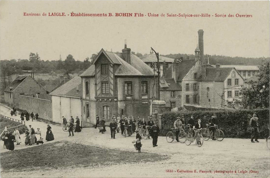 Pour terminer sur les usages « professionnels » de la bicyclette, voici une photographie extraite de l’inépuisable fonds Pasquis, photographe à l’Aigle et éditeur de carte postale de 1897 jusqu'à sa mort en 1935. Elle représente la sortie des ouvriers de l’usine des Haies (ou du Bourg), l’un des sites de la société Bohin, situé à Saint-Sulpice-sur-Risle (voir le chapitre dans ce dossier). Les ouvriers et les ouvrières prennent la pose et l’on peut noter que nombre d’entre eux se disposent à rentrer à la maison à bicyclette. Certains habitent sans doute à L’Aigle, située à moins de quatre kilomètres.