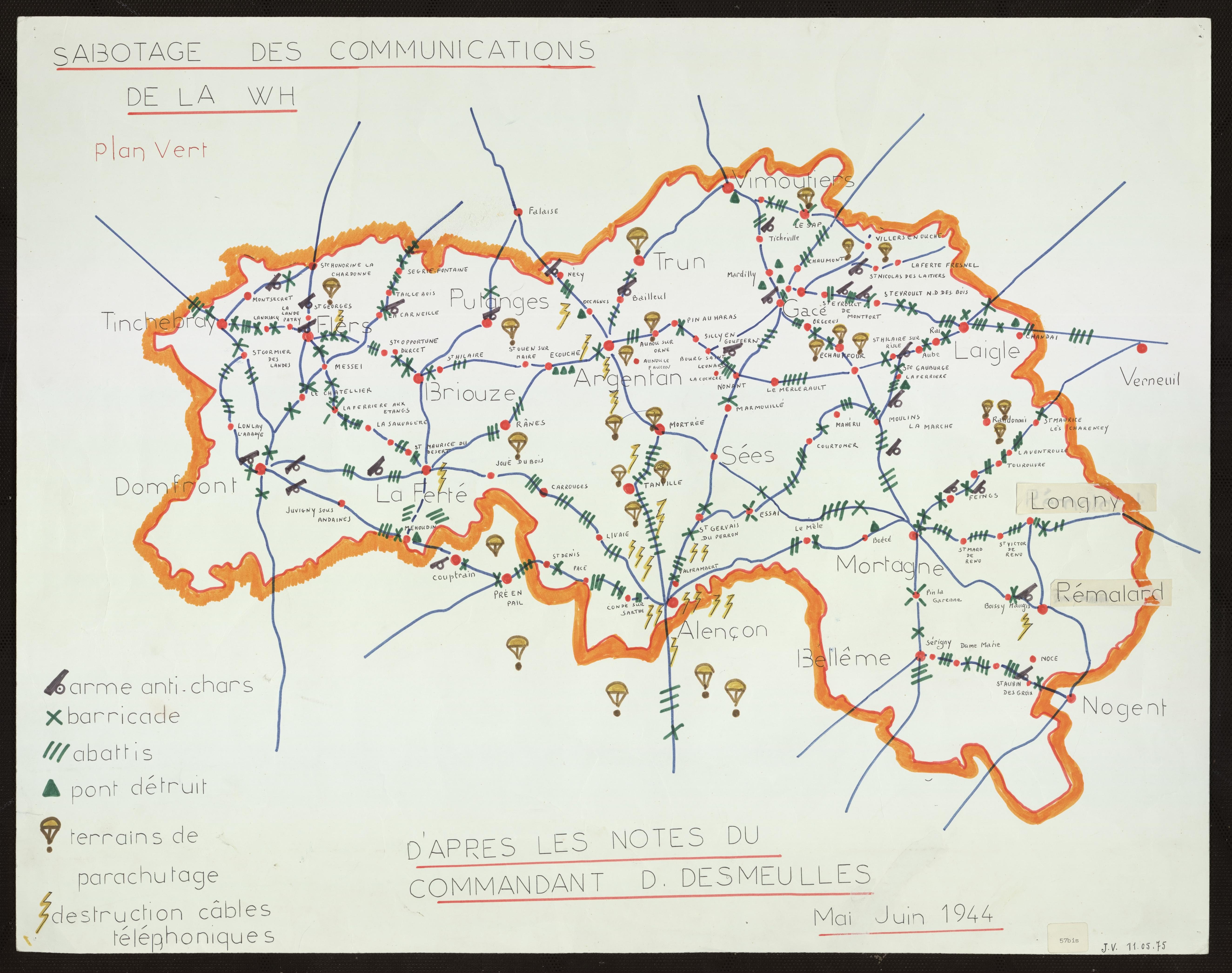 C’est à partir des notes du Commandant Desmeulles que Jean Vigile, correspondant ornais du Comité d’Histoire de la Seconde Guerre mondiale jusqu’en 1983, a réalisé la carte présentée ici.