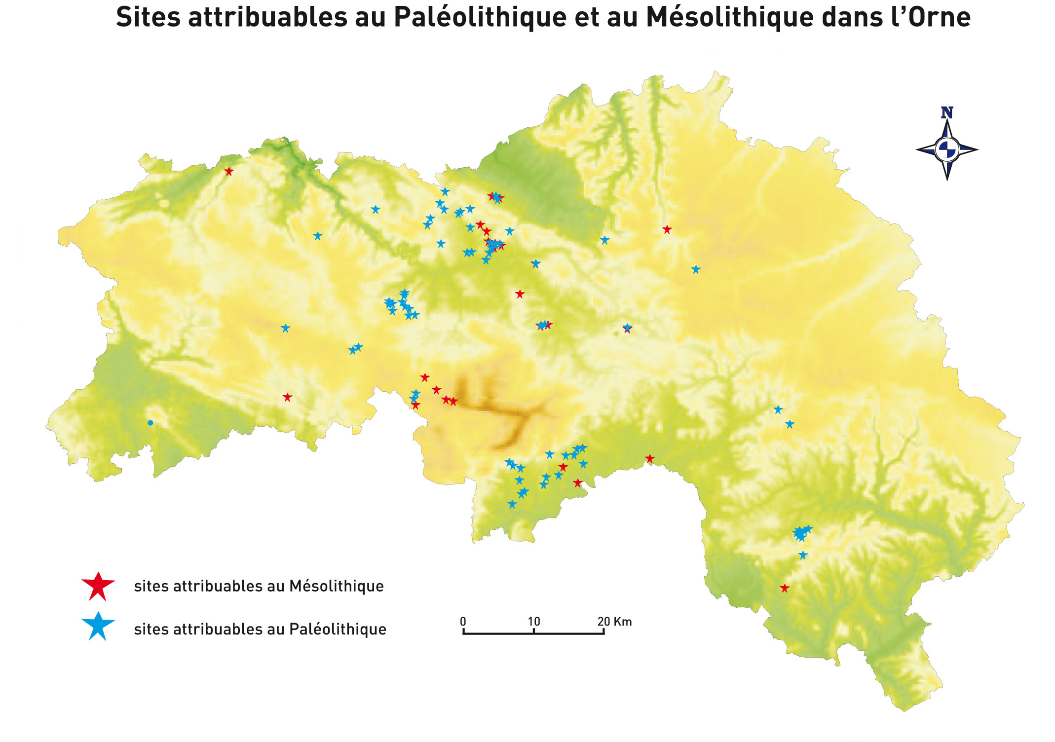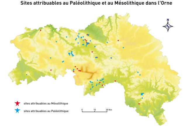 Carte des sites attribuables au paléolithique et au mésolithique dans l’Orne