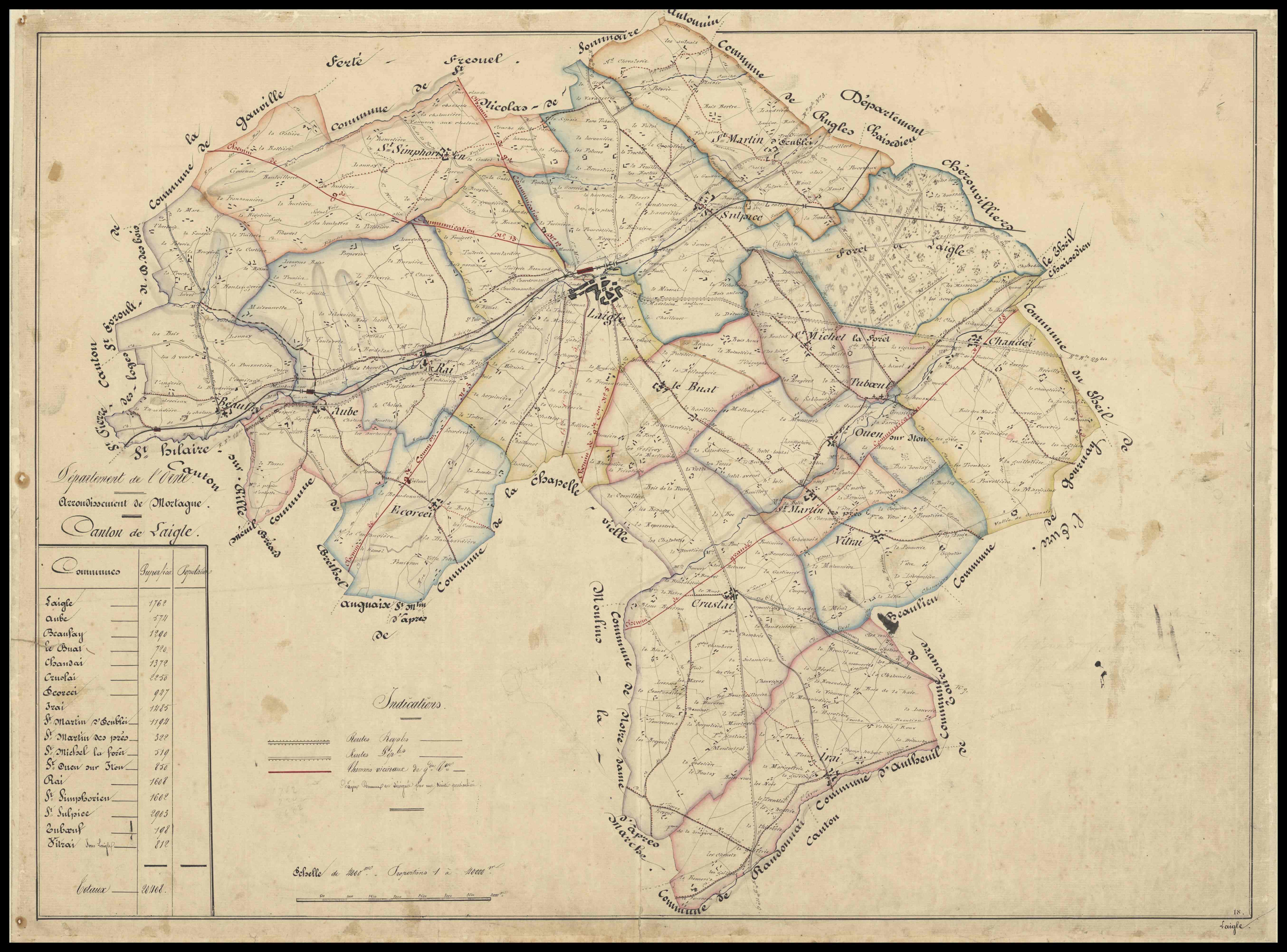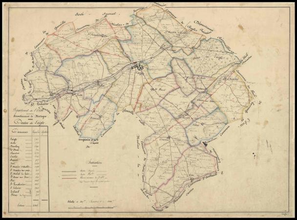 Le XIXe siècle est marqué sur tout le territoire national par une extension considérable du réseau routier nécessitée par le développement des échanges pour les hommes et les biens. Après les premières décennies consacrées essentiellement au réseau des routes royales (nationales) et départementales, le milieu du siècle voit se mettre en place, à partir de la loi du 21 mai 1836, la strate inférieure de la voirie vicinale : chemins vicinaux de grande communication, chemins vicinaux d’intérêt commun, chemins vicinaux ordinaires. À cet effet est établi dans les départements un service vicinal, dirigé par un agent voyer en chef départemental, assisté d’agents voyers ordinaires. Celui-ci a pour mission d’organiser le réseau des chemins et leur construction. Dans l’Orne, le service vicinal produit une quantité innombrable de plans de chemins vicinaux, mais aussi des cartes et en particulier, de façon systématique, des cartes cantonales, à l’instar de cette carte du canton de L’Aigle (orthographié Laigle jusqu’en 1961). Ce document est extrait d’un atlas qui regroupe les cartes manuscrites de tous les cantons, excepté celui d’Alençon. Aucune date n’est indiquée ; toutefois, les chiffres de population figurant sur certaines d’entre elles se situent entre les recensements de 1842 et 1846 et se rapprochent le plus de ce dernier ; 18441845 semble la date la plus plausible. En dehors des plans cadastraux parcellaires dits napoléoniens, les cartes cantonales du service vicinal constituent la première carte exhaustive, pour l’ensemble du département, des limites communales, lieux-dits, routes et chemins, cours d’eau, habitations, et bientôt lignes de chemins de fer.