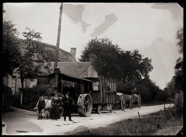 Conducteur et sa famille devant son rouleau-compresseur, région du Mesle-sur-Sarthe