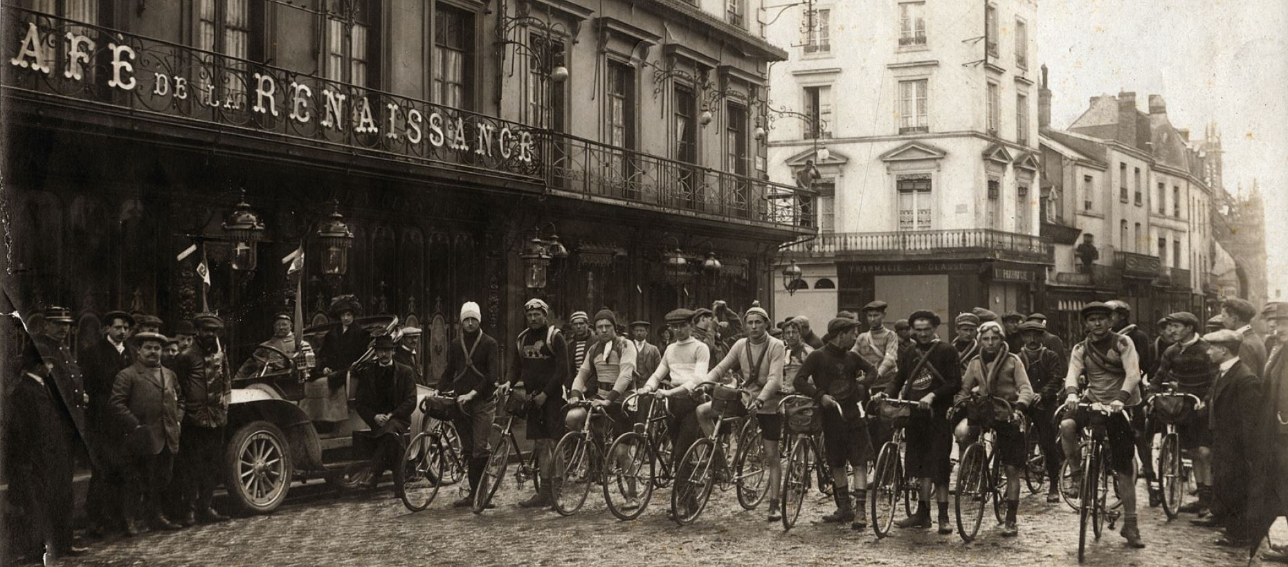 Avant d’être un moyen de transport populaire, le vélo était d’abord un engin de course, et il l’est resté, comme en témoigne cette photographie prise vers 1900 à Alençon au départ d’une course organisée par l’Union vélocipédique alençonnaise. Devant le café de la Renaissance (attesté depuis 1855), au croisement des rues Cazault et Saint-Blaise, les concurrents fixent l’objectif d’un air déterminé.