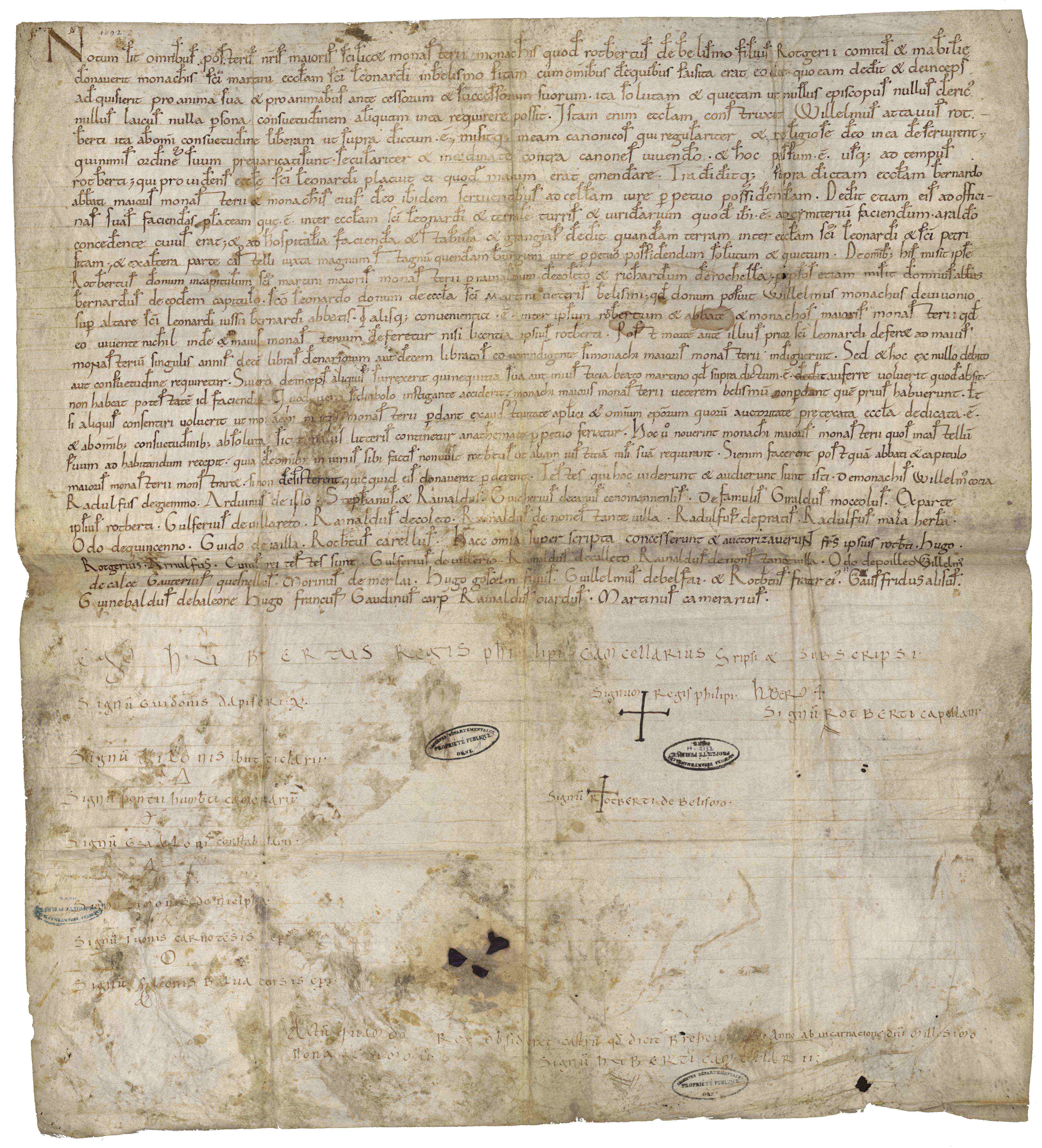 Cette charte a été rédigée par Hubert, chancelier du roi de France Philippe Ier, au cours du siège de Bréval (Yvelines) au printemps 1092. Elle comporte le seing du roi et était munie d’un grand sceau plaqué dont il ne reste que la trace.