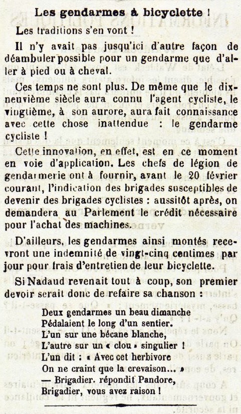 Le journaliste termine son article par une évocation ironique de la chanson de Gustave Nadaud, « Pandore ou les deux gendarmes », écrite en 1852 et aussitôt interdite car jugée trop irrévérencieuse envers la maréchaussée. Malgré la censure, elle connut un grand succès qui valut aux gendarmes le surnom de Pandore. Le nom renvoie au hollandais « Pandoer », qui désigne le gendarme, à moins qu’il ne fasse allusion à la curiosité de la Pandore de la mythologie. Quoi qu’il en soit, comme le facteur, le gendarme à bicyclette devient une silhouette familière des campagnes, abondamment utilisé dans la littérature et le cinéma.