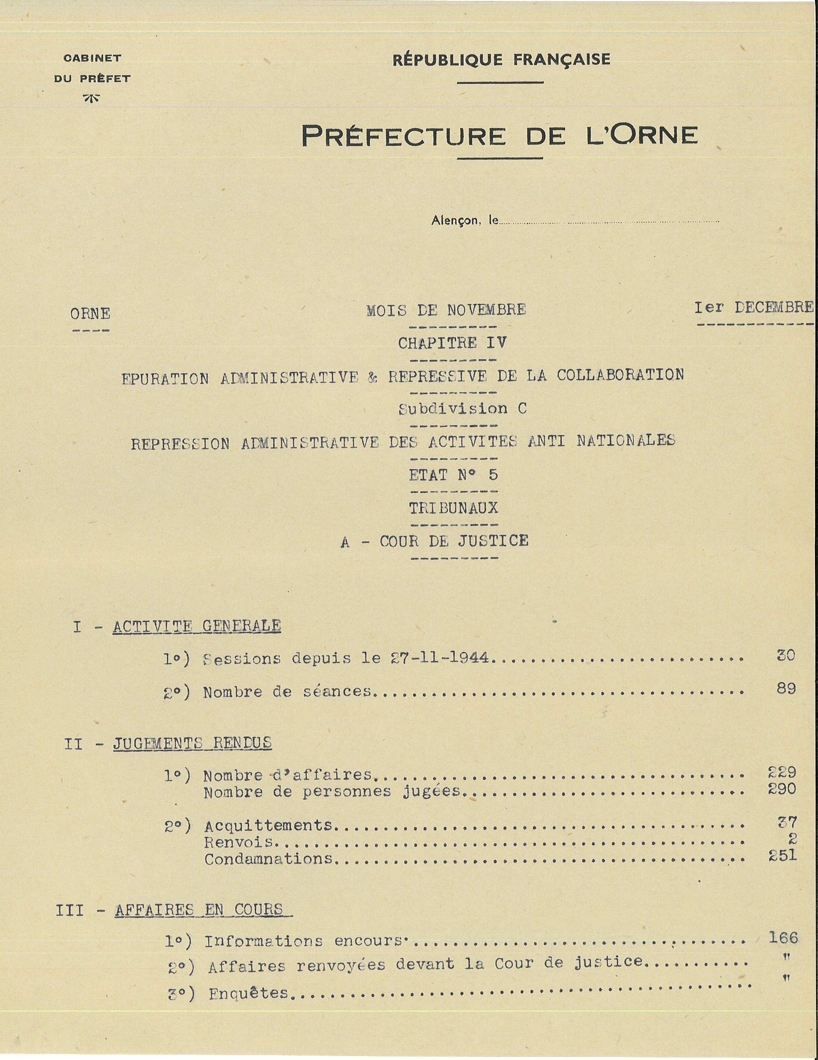 Issu des fonds de la Préfecture, le document présente le bilan de l’activité de la Cour de Justice et de la Chambre Civique de l’Orne en décembre 1945, soit un an environ après le début de leur activité.