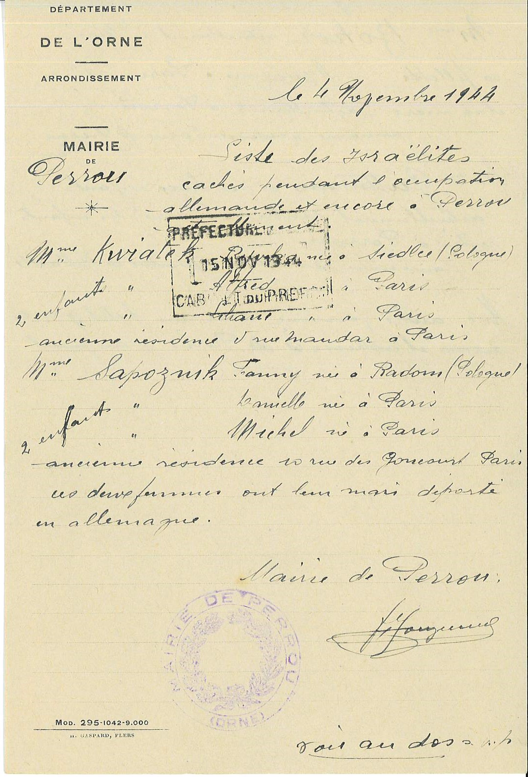 Après la Libération, les autorités françaises entreprennent de recenser les Juifs qui ont réussi à échapper à la déportation. Le 5 octobre, le préfet de l’Orne adresse donc un courrier en ce sens aux maires du département.