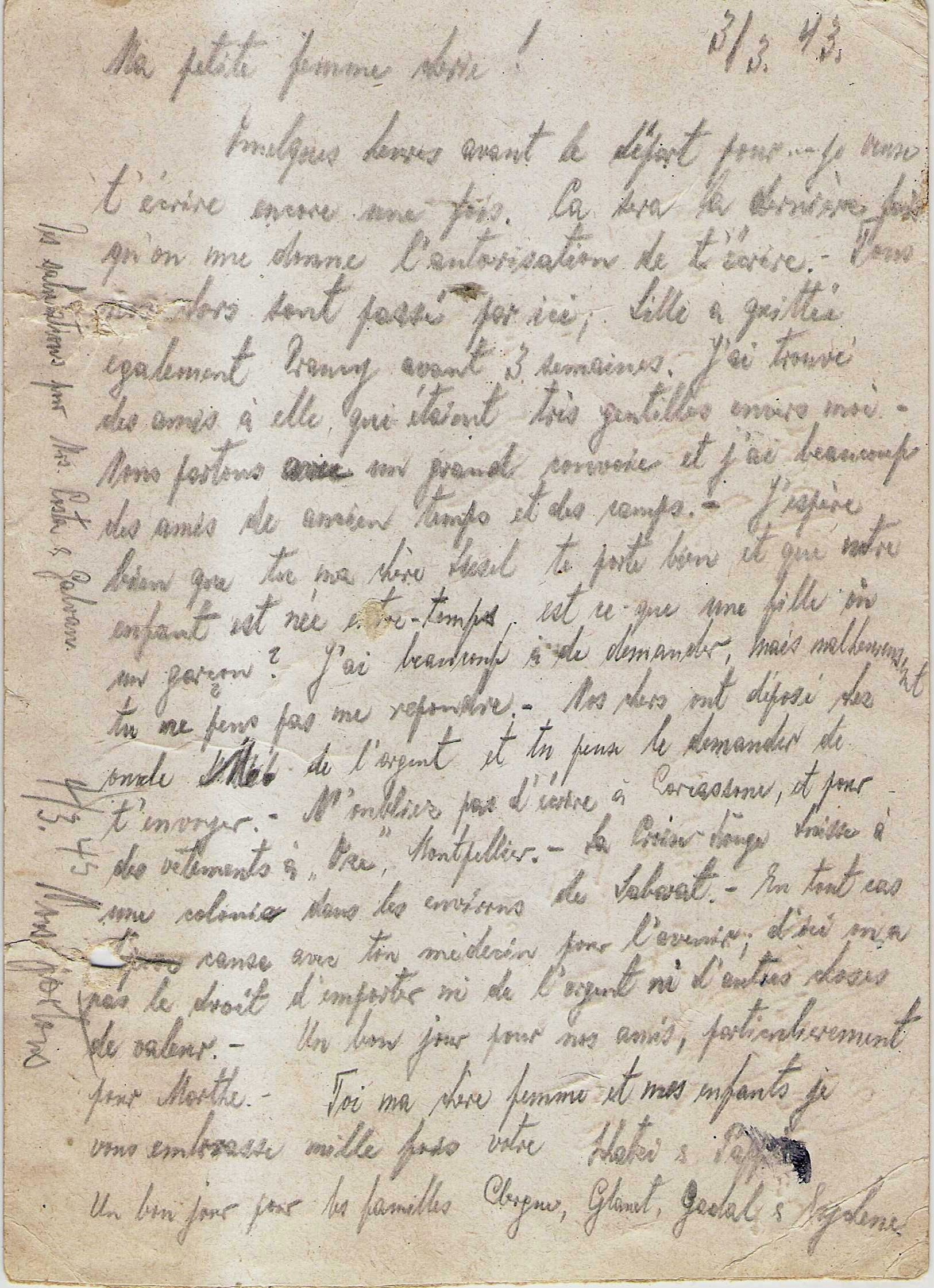 Quelques heures avant le départ pour… je veux t’écrire encore une fois. Ca sera la dernière fois qu’on me donne l’autorisation de t’écrire. Tous nos chers sont passés par ici, Lilli a quittée également Drancy avant 3 semaines. J’ai trouvé des amis à elle qui étaient très gentilles envers moi. Nous partons avec un grand convoi et j’ai beaucoup des amis de ancien temps et des camps. J’espère bien que tu ma chère Liesel te porte bien et que notre enfant est née entre-temps. Est-ce une fille ou un garçon ? J’ai beaucoup à te demander, mais malheureusement tu ne peux pas me répondre. Nos chers ont déposé chez oncle [M] de l’argent et tu peux le demander de t’envoyer. N’oublies pas d’écrire à Carcassonne et, pour des vêtements à « Ore » [ ?] Montpellier. La Croix Rouge suisse a une colonie dans les environs des Sabarat. En tout cas, cause avec ton médecin pour l’avenir ; d’ici on n’a pas le droit d’emporter ni de l’argent ni d’autres choses de valeur. Un bon jour pour mes amis, particulièrement pour Marthe. Toi ma chère femme et mes enfants je vous embrasse mille fois. Votre khatsi et Pappé. Un bon jour pour les familles Clesgue, Glanet, Godal et Eychene.