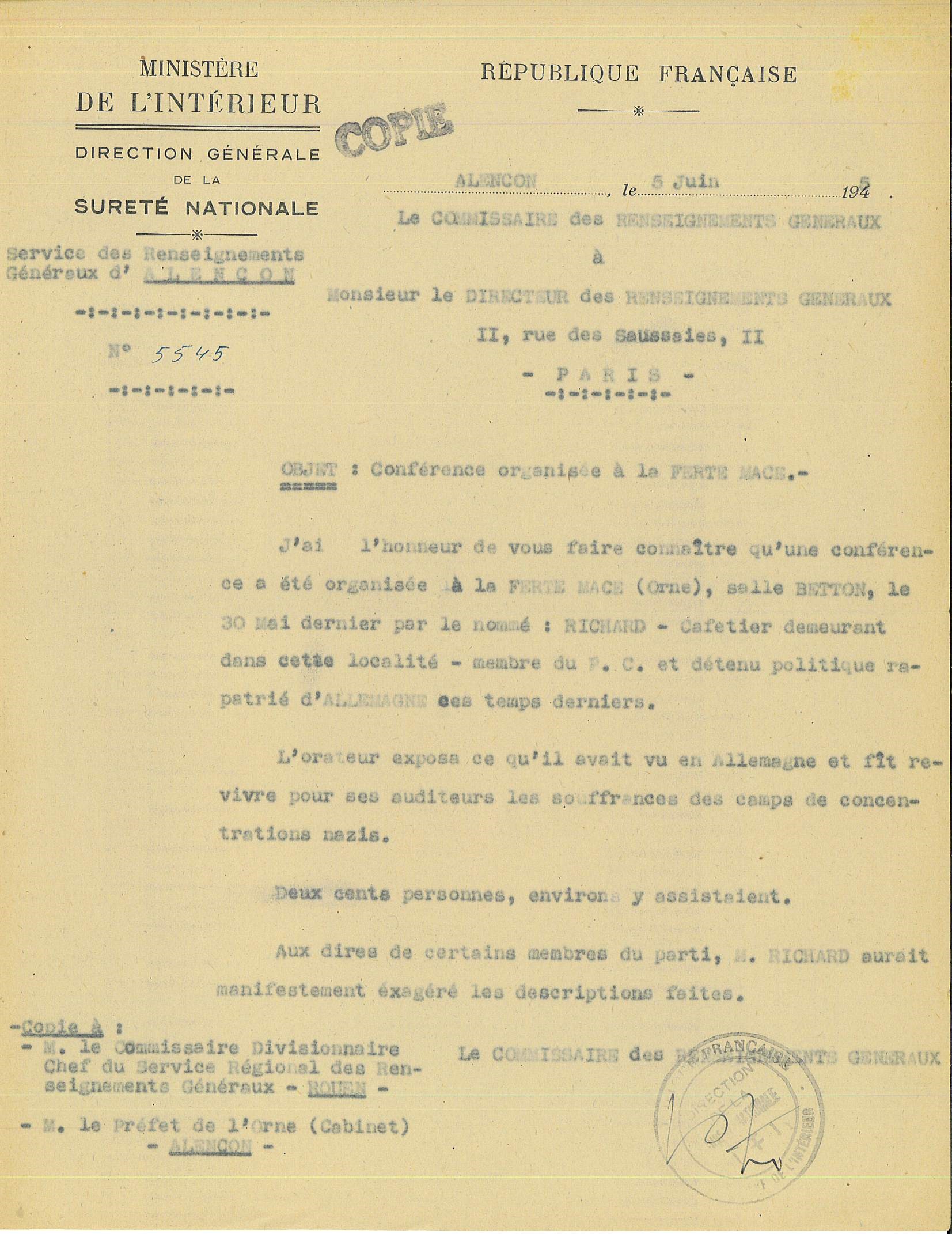 Le document présenté est un courrier du commissaire des renseignements généraux adressé à sa hiérarchie et au préfet au sujet d’une conférence organisée à La Ferté-Macé par un ancien déporté rescapé des camps, membre du Parti communiste, devant une assistance assez nombreuse (200 personnes) semble-t-il.