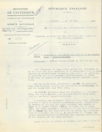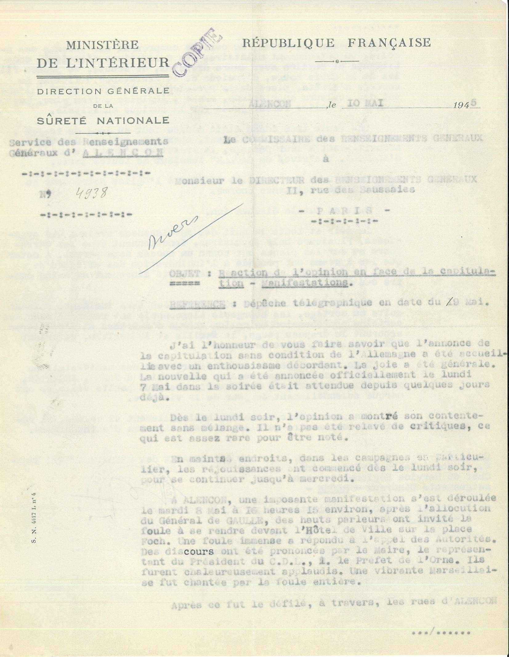Les renseignements généraux adressent au préfet un courrier pour décrire l’accueil enthousiaste par les populations ornaises de l’annonce de la capitulation allemande. Le document dans son intégralité est disponible au format pdf par le lien ci-dessus.