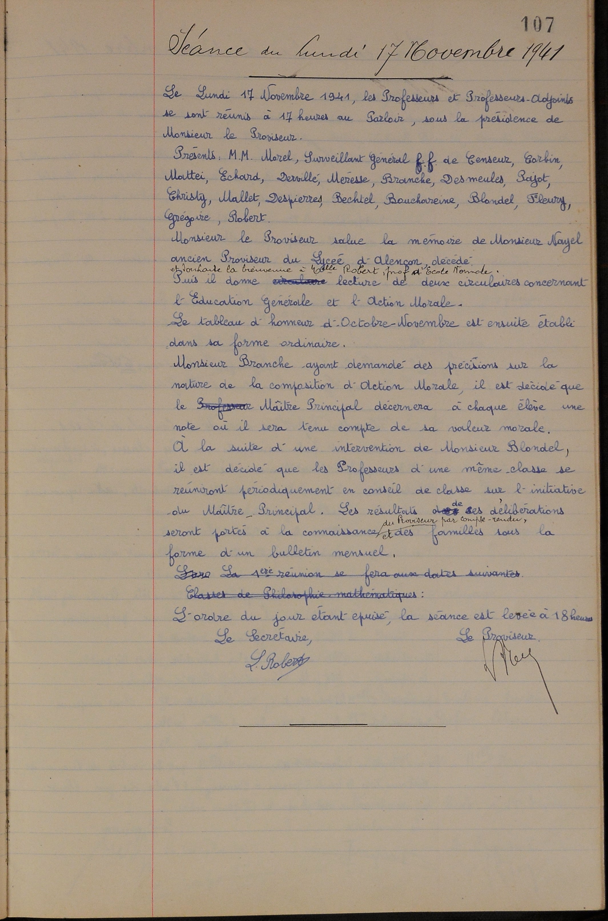 L’enseignement de la morale est donc placé au centre du projet éducatif de Vichy. En novembre 1940, les programmes du primaire rétablissent dans les programmes l’enseignement des « devoirs envers dieu ». Le document présenté ici montre que les lycées ne sont pas épargnés par cette obsession. Il s’agit du compte-rendu de l’assemblée générale du lycée d’Alençon tenue le 17 novembre 1941. Une fois par mois environ, ces réunions des principaux professeurs évoquaient les principales questions pédagogiques. On peut relever parmi les présents le nom de Daniel Desmeulles qui, à cette date, est déjà engagé dans la Résistance.