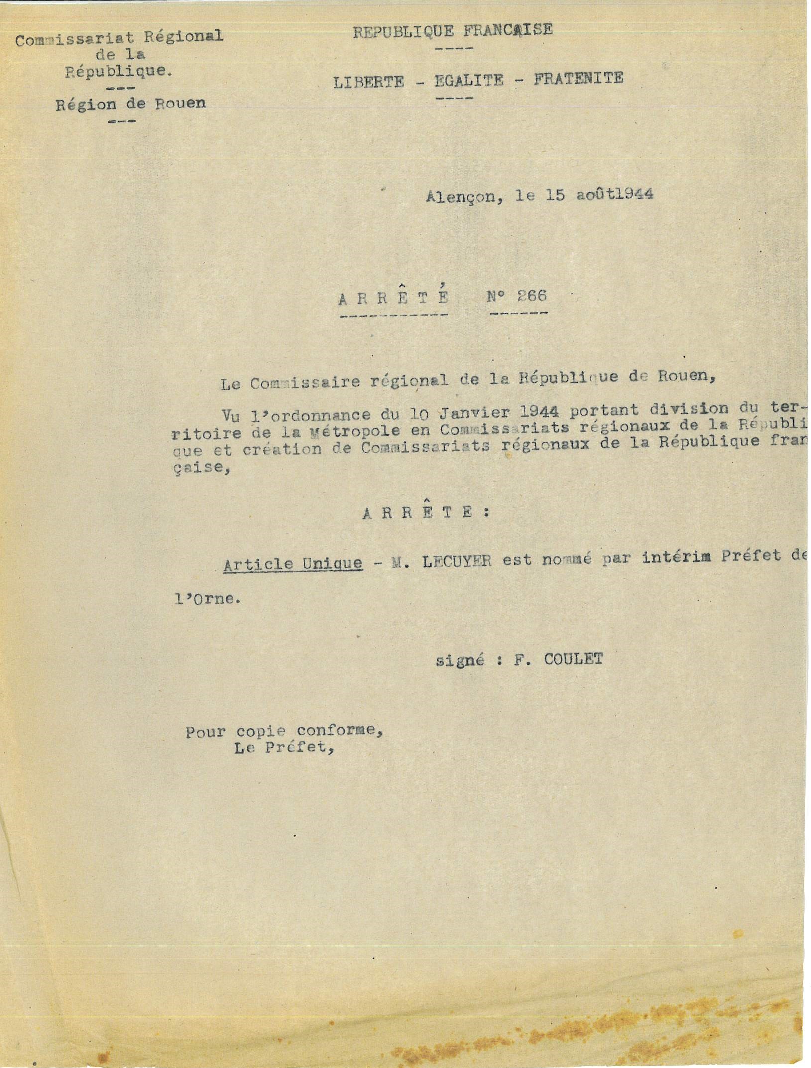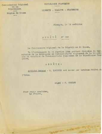 Alençon est libérée le 12 août 1944 ; quelques jours plus tard (le 13 d’après l’Orne combattante), Robert Lécuyer, ingénieur en chef du génie rural, prend ses fonctions de préfet. A 30 ans, il est le plus jeune préfet de France. Le document présenté ici est son arrêté de nomination publié le 15 août par le Commissaire Régional de la République, François Coulet, lui-même installé par de Gaulle à Bayeux dès juin 1944. Robert Lécuyer remplace ainsi le préfet Jean Leguay nommé par Vichy le 30 janvier 44 et qui sera révoqué de l’administration préfectorale en mai 45 puis inculpé en 1979 pour crime contre l’humanité. Il avait notamment joué un rôle central dans la rafle du Vélodrome d’Hiver alors qu’il était le délégué à Paris de René Bousquet, chef de la police de Vichy .