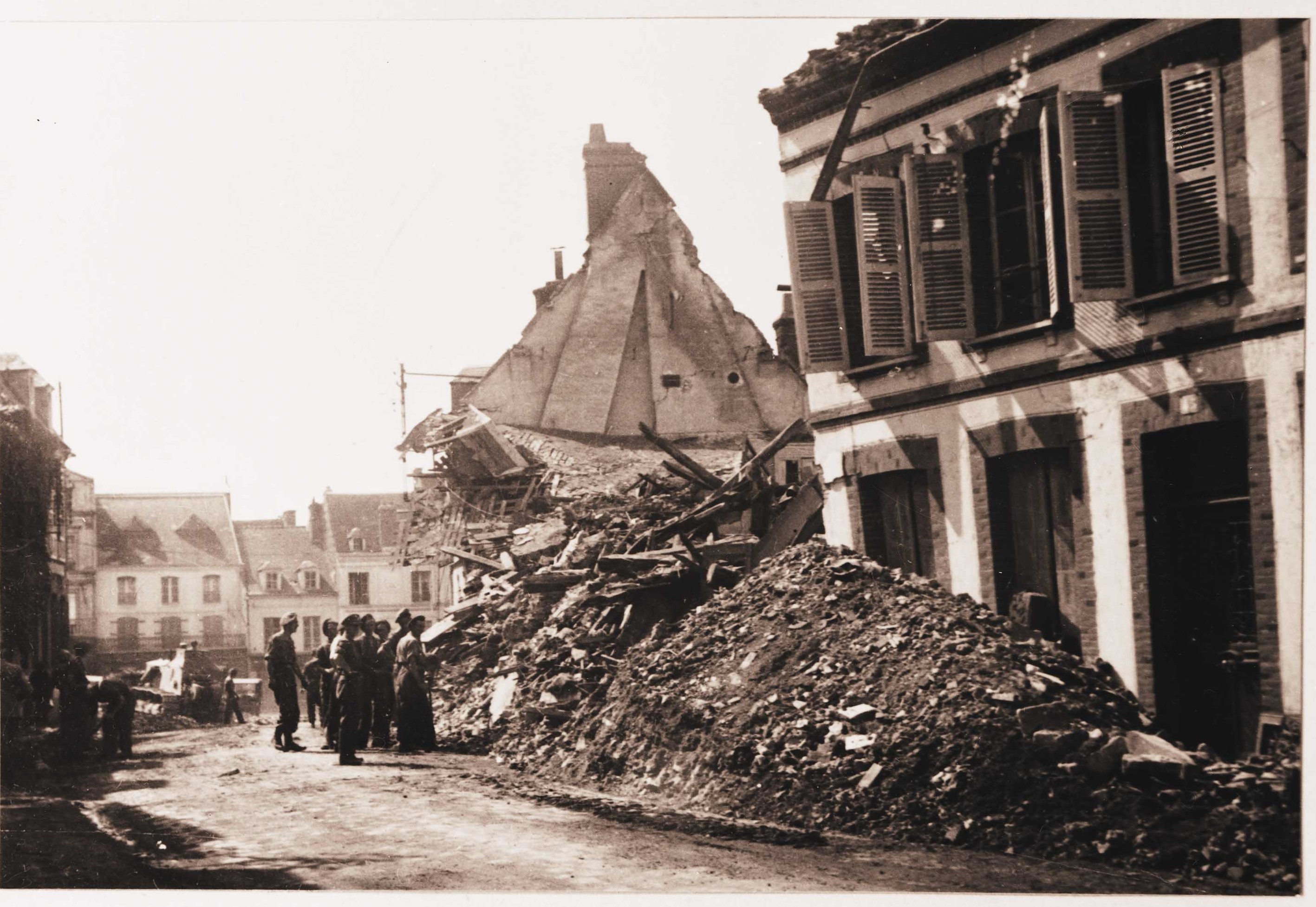 La photographie est prise en août 1944 peu après la libération de la ville puisque l’on peut reconnaître des soldats britanniques occupés, semble-t-il, à déblayer les décombres de la rue Saint-Jean. A l’arrière-plan sur la place, on peut identifier un engin de terrassement utilisé pour dégager la rue.