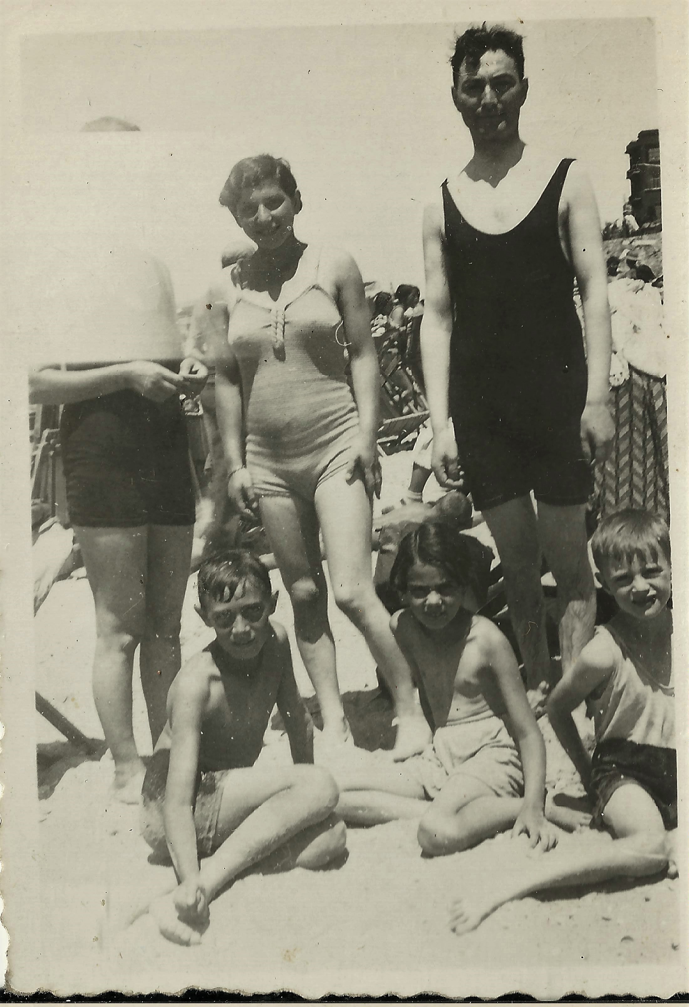 Un après-midi à la plage à Tel-Aviv, sans doute pendant le printemps ou l’été 1935. On reconnaît les trois enfants de la famille Bonnem : de gauche à droite, Berthold, 10 ans, Edith, 8 ans et Rudolph, 6 ans. Derrière eux, debout se tient Liesel, leur tante (et Edgard ?). Tous sont en tenue de plage pour une scène très ordinaire. Le contexte pourtant l'est un peu moins : ces enfants souriants sont des réfugiés, fraîchement débarqués dans une Palestine où couve la Grande révolte arabe qui éclatera en 1936. Moins de deux ans plus tard, ils repartiront vers l'Orne, où ils croient trouver un refuge plus sûr.