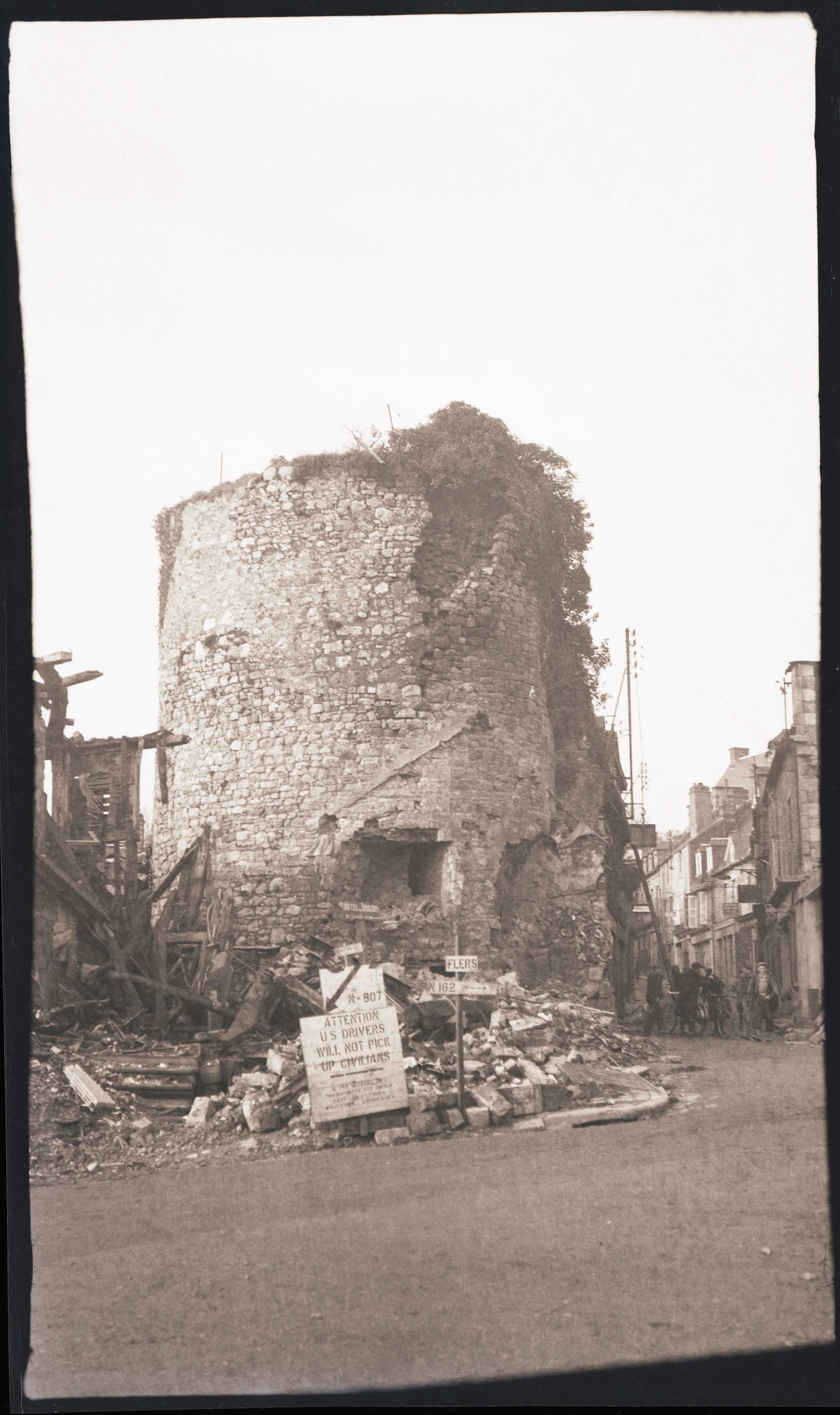 Une pancarte porte l’indication « ATTENTION US DRIVERS WILL NOT PICK UP CIVILIANS », avec une traduction en français difficilement lisible (peut-être : « Il est interdit de transporter des civils dans les voitures militaires américaines »). Enfin, un panneau indique l’hôtel du donjon, vers la droite, mais la photographie suivante montre qu’il n’est malheureusement plus en état de recevoir des clients.