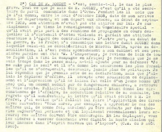 Dans cet extrait, le rapport de l’Inspecteur Mollard évoque donc le cas de Roland Boudet, instituteur à Athis-de-l’Orne et secrétaire départemental du parti communiste avant la guerre. Instituteur et communiste, voilà une situation pour le moins délicate sous le régime de Vichy. Rappelons que, avant même l’installation du régime de Vichy, dès le 26 septembre 1939, le parti communiste est dissout par le gouvernement d’Edouard Daladier qui lui reproche son soutien au pacte germano-soviétique ; ses députés sont condamnés par la justice et la propagande communiste est interdite. Profondément anticommuniste, Pétain va accentuer cette répression.