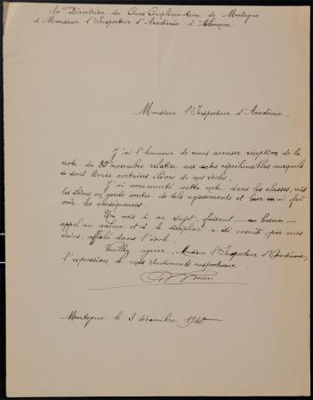 Il s’agit d’un courrier adressé le 3 décembre 1940 par Mme Morin, la directrice du Cours complémentaire de Mortagne-au-Perche à son Inspecteur d’Académie (Mollard). Les Cours complémentaires, dispensés dans le cadre des écoles primaires supérieures, accueillent les élèves qui, après le certificat d’études primaires (obtenu entre 11 et 13 ans), poursuivent leur scolarité mais ne souhaitent ou ne peuvent pas aller au lycée (payant). On y trouve les enfants des classes moyennes ; il correspond à peu près à notre collège d’aujourd'hui.