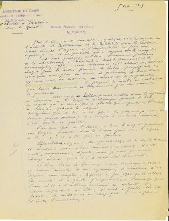 Le 1er mars 1945, le Rectorat de Caen relaie auprès de l’inspecteur d’Académie de l’Orne une demande du ministère de l’Education Nationale qui souhaite recenser les « activités dans la résistance pour tous degrés [des] enseignements publics et privés » (Lettre du Recteur d’Académie à l’Inspecteur d’Académie de l’Orne, 1er mars 1945, 1677W1). L’Inspecteur d’Académie, R. Morel, transmet alors cette demande aux inspecteurs du 1er degré et aux établissements du département ; nous présentons ici la réponse envoyée par l’inspectrice du secteur d’Alençon. Une partie des informations de ce document figure déjà dans le rapport de l’Inspecteur académique étudié plus haut mais il nous a paru intéressant de le présenter dans son intégralité, disponible au format pdf par le lien ci-dessus. Une transcription du texte est également disponible ci-dessous.
