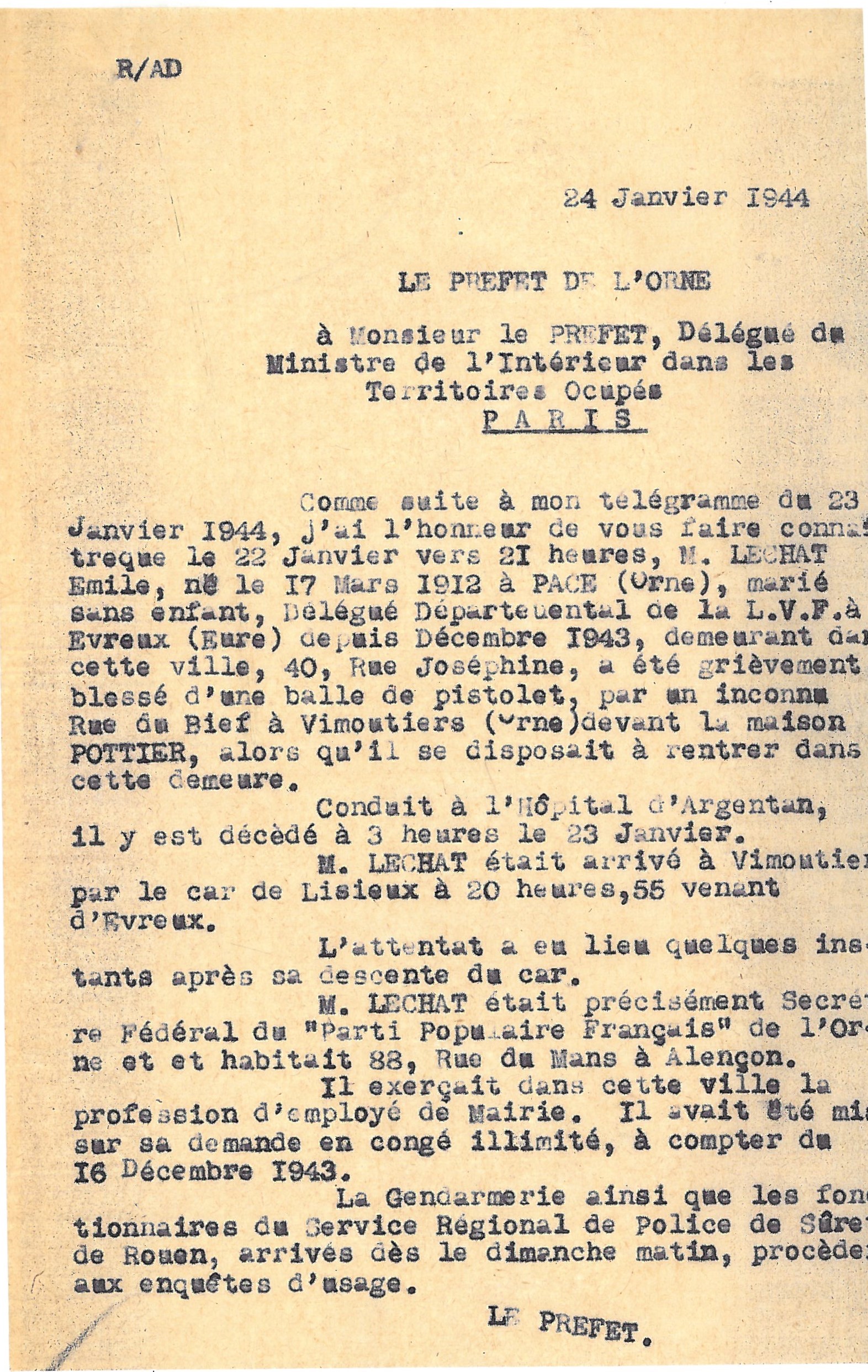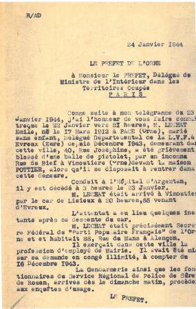 Le courrier présenté ici est adressé par le préfet de l’Orne, Georges Bernard, à Jean-Pierre Ingrand, le représentant à Paris du ministre de l’Intérieur de Vichy pour l’informer de la mort de Lechat. Cet événement en effet, intéresse particulièrement les autorités françaises puisqu’il concerne l’un de leurs serviteurs « indirects ». Le courrier ne mentionne ni les auteurs ni les motifs de cette exécution mais personne ne doutait alors qu’elle était l’œuvre de la Résistance. De fait, ce sont deux Francs Tireurs et Partisans d’Argentan (« Claude » et « Nimbus ») qui ont mené l’opération ; le gendarme Pierre Annic, membre du groupe OCM de Vimoutiers, dépêché sur les lieux pour l’enquête, parvient à subtiliser la douille de la cartouche utilisée.