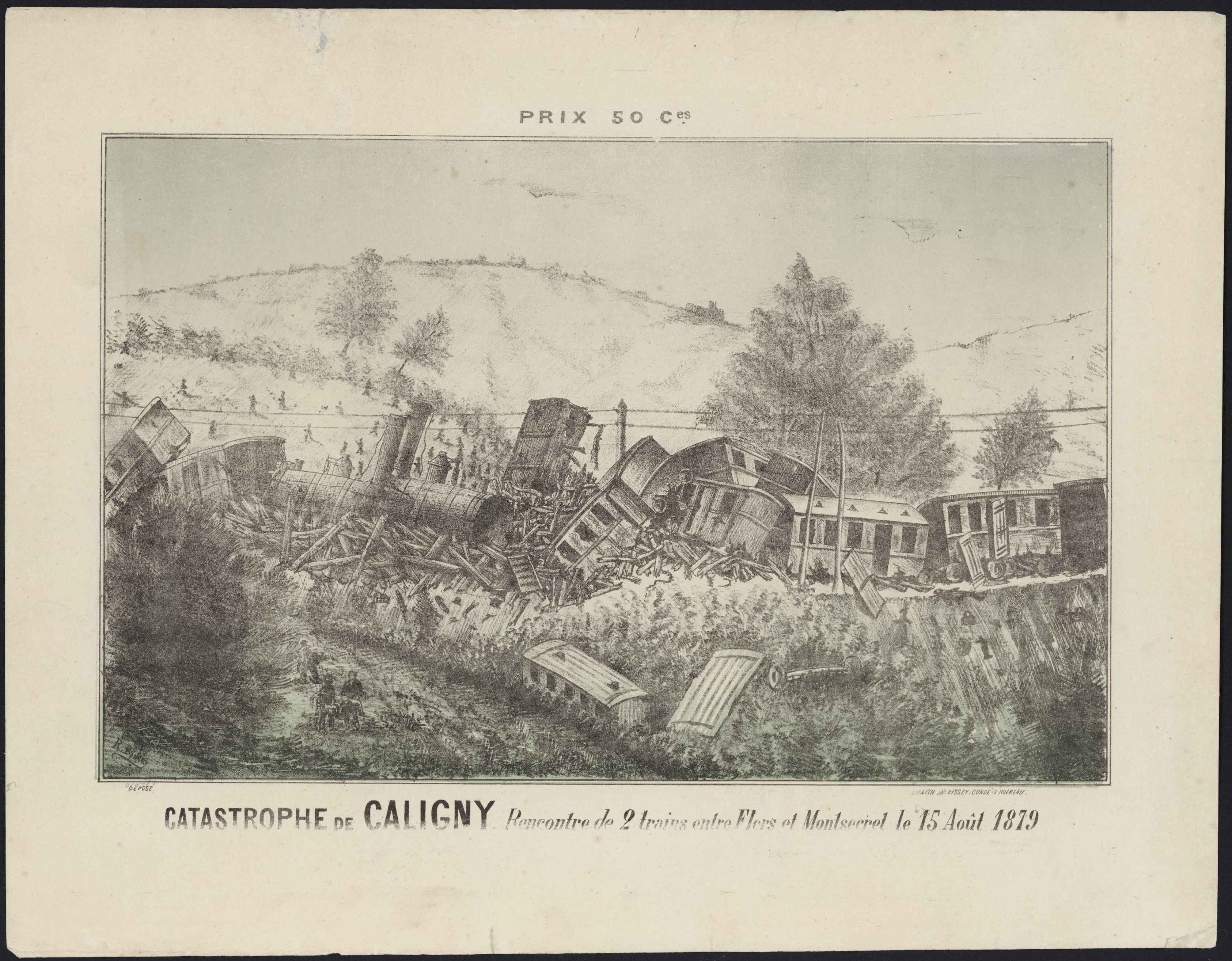 Il s’agit d’une lithographie (sans date) réalisée par Narcisse Bissey, imprimeur, libraire et lithographe à Condé-sur-Noireau (actuelle Condé-en-Normandie). Elle représente l’accident survenu le 15 août 1879 sur la ligne Paris-Granville, sur la commune de Cerisy-Belle-étoile, à 500 m de Caligny.