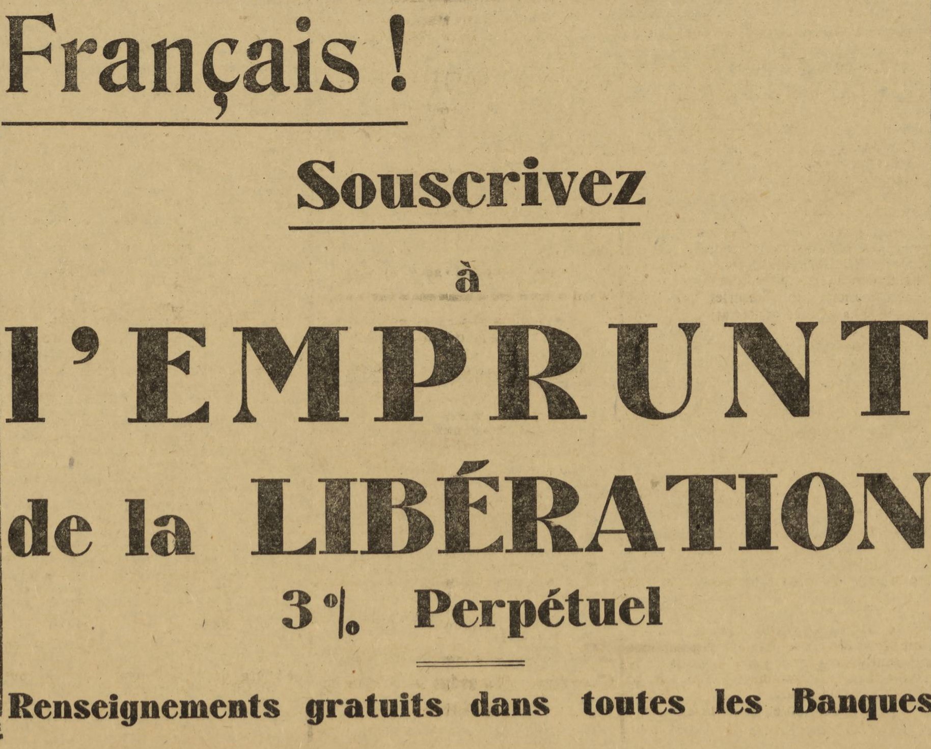 Pour faire face aux difficultés économiques, financer l’effort de guerre et les débuts de la reconstruction, le GPRF lance un emprunt public en novembre 1944. Le document présenté est un encart paru dans L’Orne Combattante le 12 novembre 1944.
