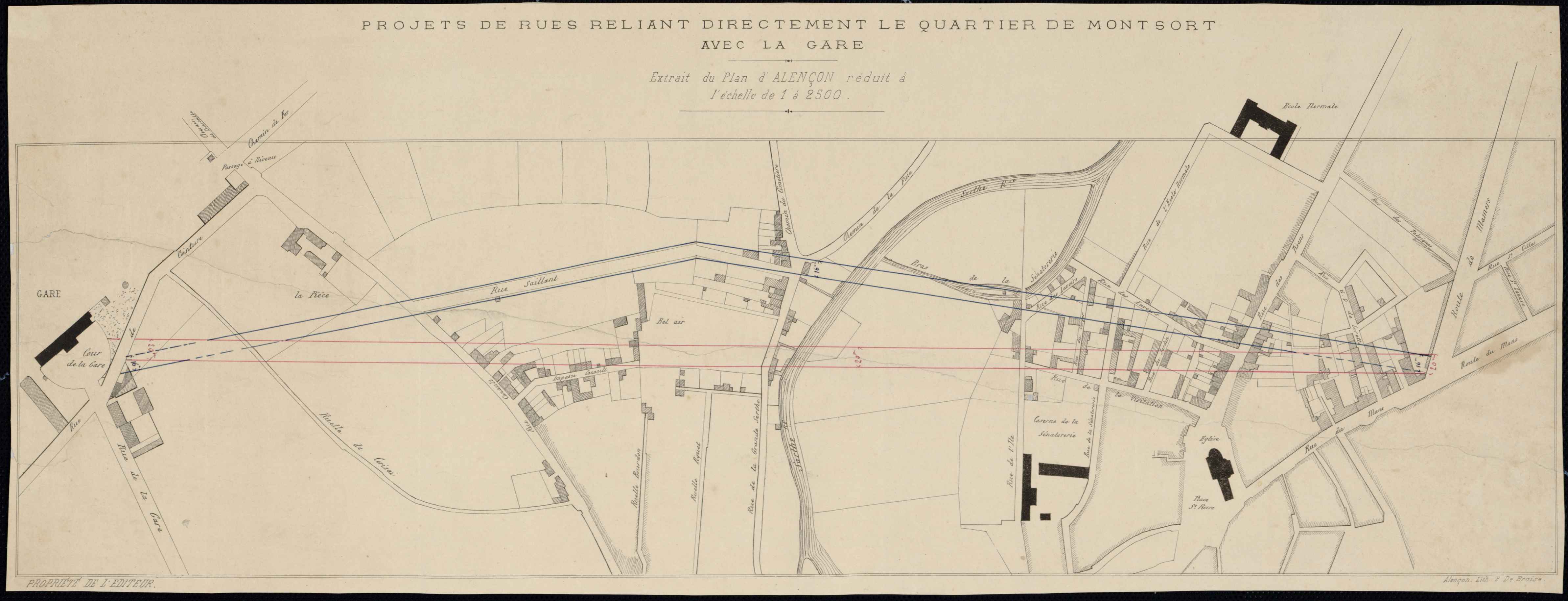 Ce plan d’un projet de modification des rues d’Alençon montre comment l’arrivée du train a transformé l’espace urbain. Il date vraisemblablement de la fin des années 1860. En rouge figure le projet d’un axe reliant la gare, au Nord, au quartier de Monsort, situé en périphérie sud de la ville, à l’entrée de l’axe routier vers Le Mans. C’est l’actuel boulevard de la République et sa continuation dans le boulevard Lenoir-Dufresne qui est donc tracé ici. Il constitue le principal axe Nord/Sud de la ville et joue toujours aujourd'hui un rôle structurant dans l’organisation urbaine. Son percement est décidé en 1866 « Le premier tronçon, de la rue Cazault à la rue de l’Ile, est aménagé en 1881-82 ; le deuxième, de la rue de l’Ile à la rue des Tisons, en 1890 ; le troisième, de la rue des Tisons à l’avenue Leclerc, en 1896. Le pont sur la Sarthe est construit en 1882. » (Alain Champion, Dictionnaire des rues et monuments d’Alençon, Editions Cénomane, 2003, s.v. « République (boulevard de) »). En reliant la gare à la route du Mans, le percement du boulevard de la République répond donc au besoin de connecter le réseau ferroviaire au réseau routier et de développer ce que nous appelons aujourd'hui la multimodalité.