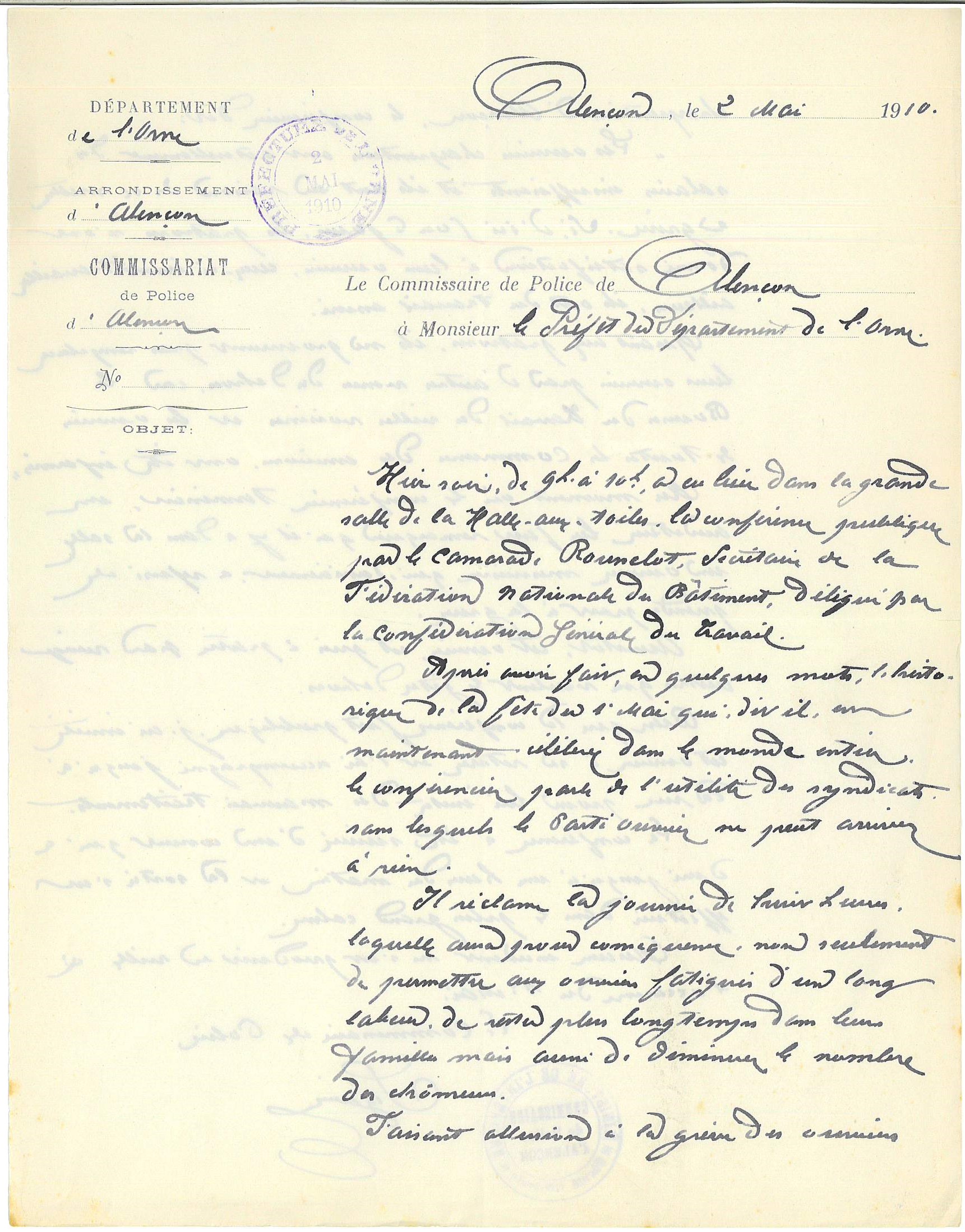 Le document présenté est le rapport rédigé par le Commissaire de police d’Alençon à l’attention du préfet de l’Orne pour rendre compte du déroulement de la journée du 1er mai 1910. Il permet d’aborder les thèmes de l’action syndicale et de la sociabilité ouvrière.