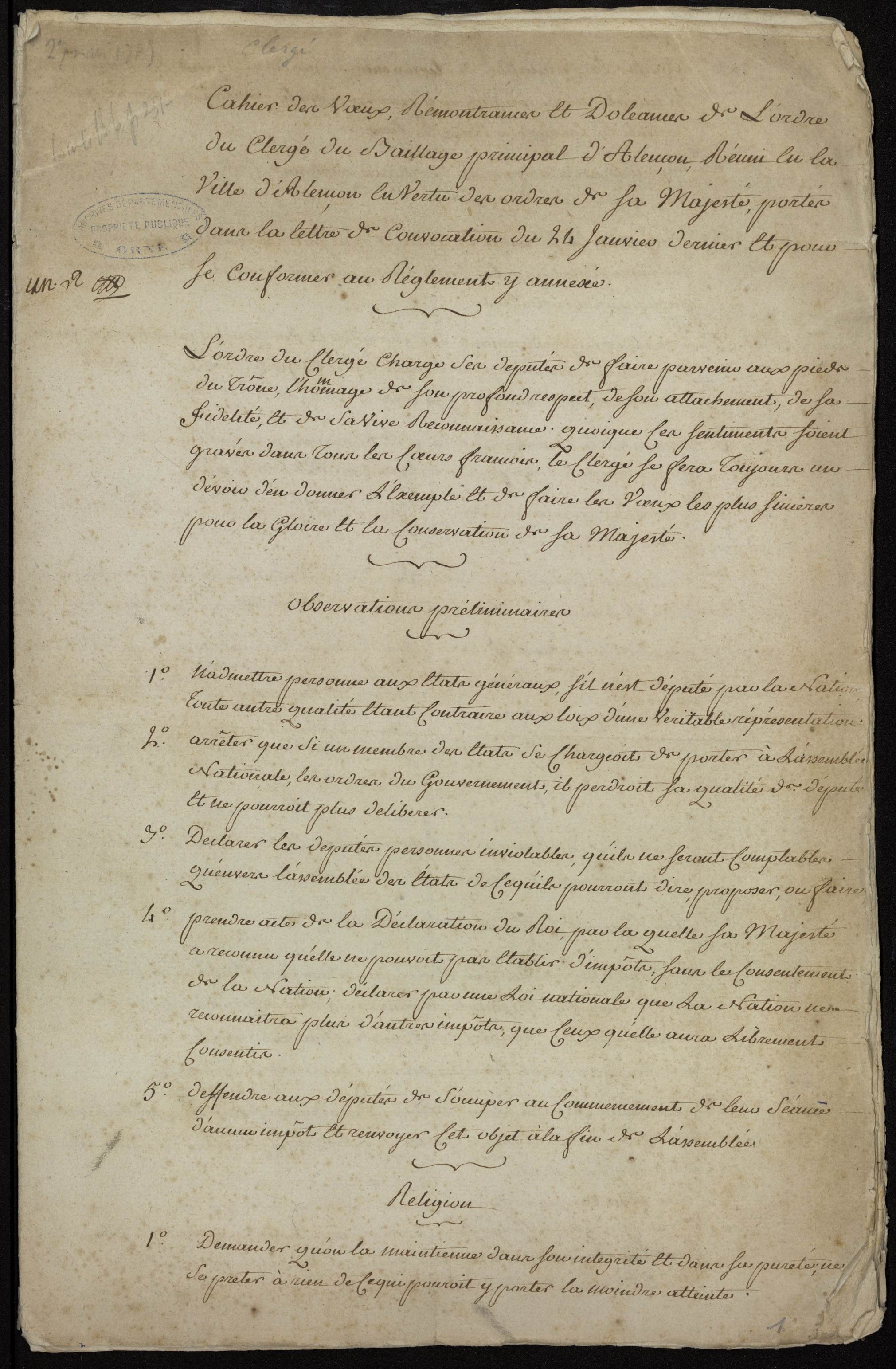 Cahier des vœux, remontrances et doléances de l’ordre du clergé du baillage principal d’Alençon, réuni en la ville d’Alençon en vertu des ordres de Sa Majesté ; portés dans la lettre de convocation du 24 Janvier dernier et pour se conformer au règlement y annexé.