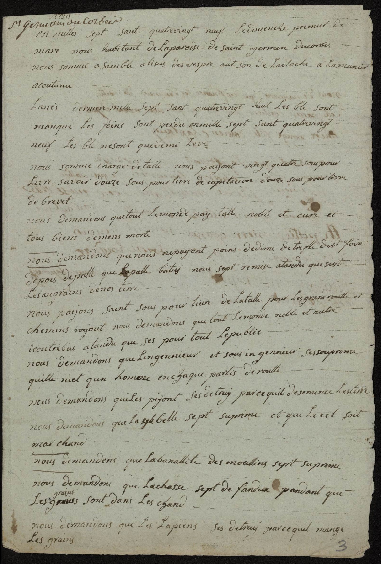 Ainsi, les habitants de Saint-Germain-du-Corbéis se plaignent de toutes ces charges qui les accablent et rejoignent donc les revendications exprimées par le tiers à travers tout le royaume. Mais ils vont au-delà et réclament la suppression des inégalités caractéristiques de l’Ancien Régime :