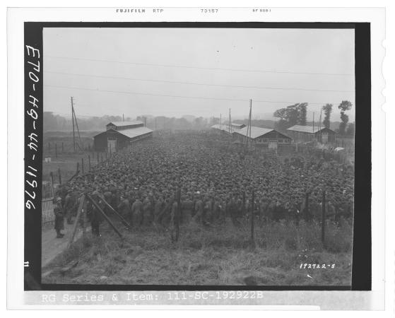 Issue d’une série de photographies de l’armée américaine, ce cliché montre des prisonniers allemands détenus dans l’un des plus grands camps de Normandie, à Nonant-le-Pin.