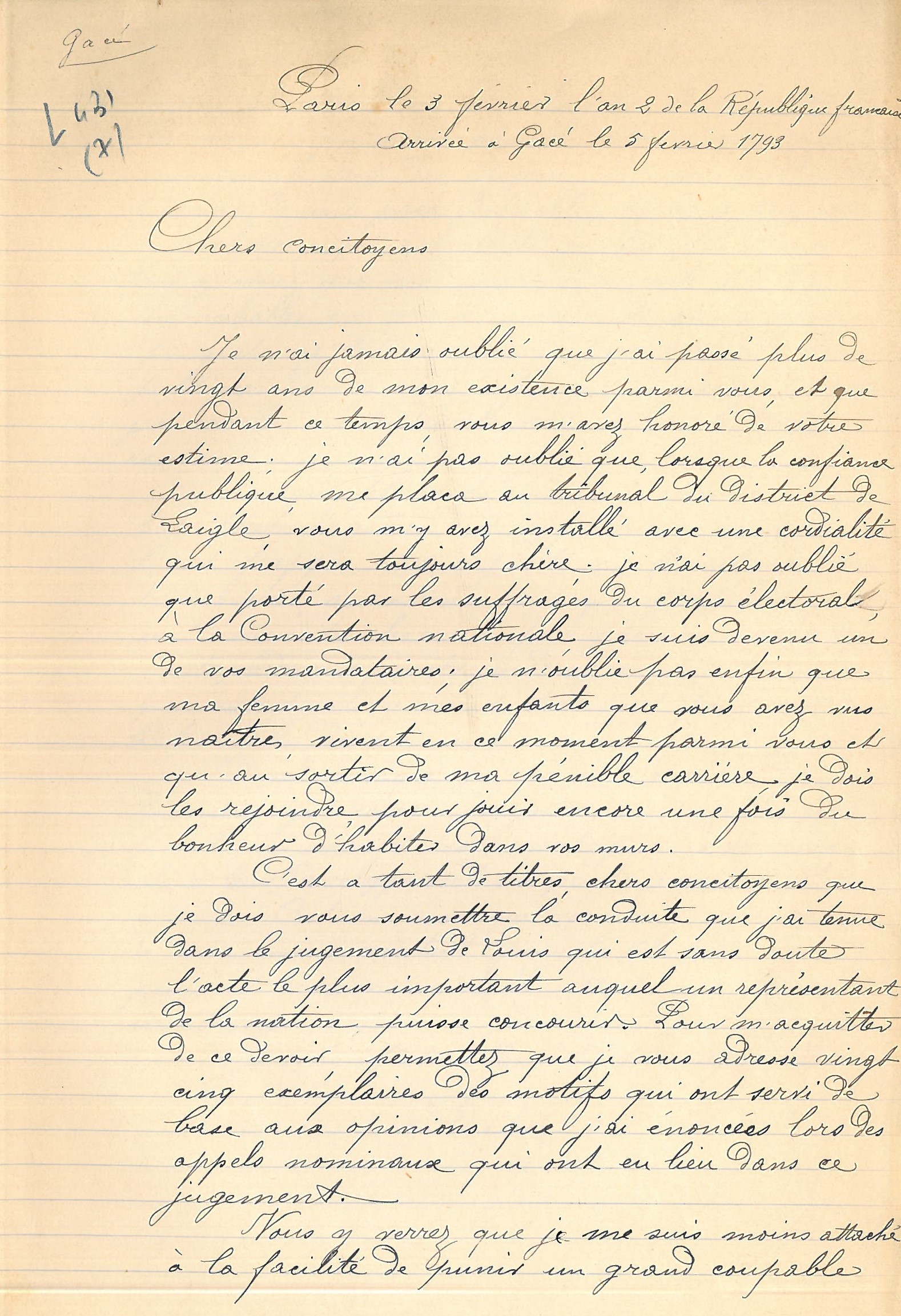 C'est à tant de titres, chers concitoyens, que je dois vous soumettre la conduite que j'ai tenue dans le jugement de Louis qui est sans doute l'acte le plus important auquel un représentant de la nation puisse concourir. Pour m'acquitter de ce devoir, permettez que je vous adresse vingt-cinq exemplaires des motifs qui ont servi de base aux opinions que j'ai énoncées lors des appels nominaux qui ont eu lieu dans ce jugement.