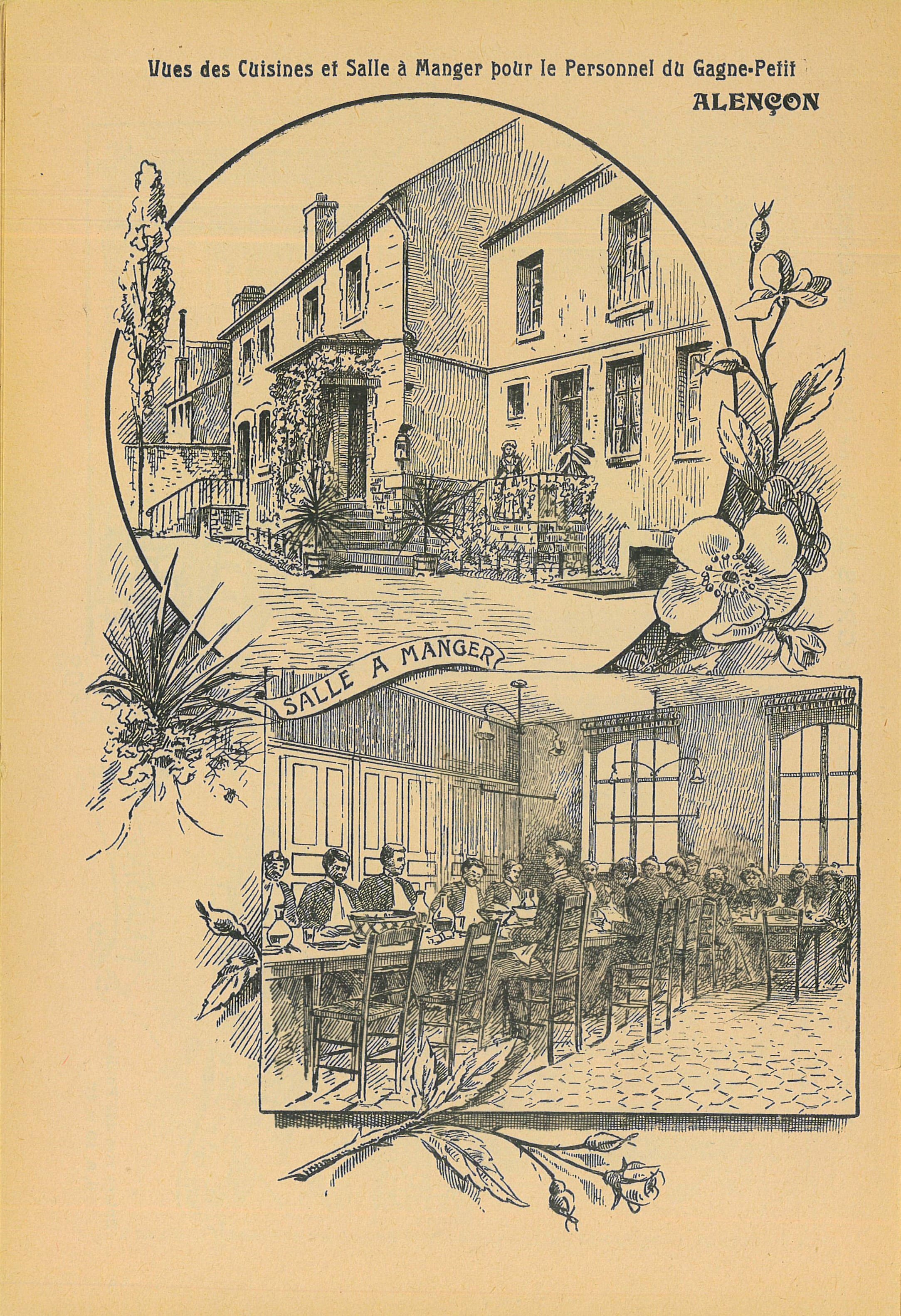 Extraite de l’agenda de 1906, la page reproduite ici présente des « vues des cuisines et salle à manger » des employés du magasin. Ils sont nombreux : on compte jusqu’à 215 personnes dans les ateliers de confection auxquels il faut ajouter les vendeurs et le personnel administratif. D’une manière générale, les agendas mettent en avant des valeurs bourgeoises traditionnelles. A l’égard du personnel, Pierre Romet puis ses fils pratiquent une gestion que l’on peut qualifier de « paternaliste ». C’est sans doute cette bienveillance patronale que l’agenda cherche ici à mettre en avant en montrant les vastes cuisines et la salle à manger propre, confortable et lumineuse. L’entreprise a également été une pionnière du repos hebdomadaire avec la fermeture du dimanche (en 1902). En 1922, elle instaure un système d’allocations familiales puis une pouponnière en 1936.
