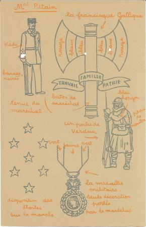 Pour que l’école diffuse la propagande pétainiste, les services de Vichy fabriquent du matériel pédagogique. Le document présenté ici en constitue un exemple ; il s’agit d’une vignette à colorier représentant le maréchal Pétain ; au verso, on trouve une biographie (ou plutôt une hagiographie, disponible en pdf par le lien ci-dessus) du maréchal. Cette vignette est la dernière d’un recueil intitulé « La France que nous aimons » publié à l’automne 1942. On y trouve toutes les figures historiques qui, selon Vichy, constituent les gloires de la France : Vercingétorix, Sainte-Geneviève, Clovis, Charles Martel, Saint-Louis, Jeanne d’Arc, Bayard, Jacques Cartier, Turenne, Henri IV, Sully, Pascal, La Fontaine, Louis XIV, Jean Bart, Denis Papin, Les Frères Montgolfier, Marceau, Napoléon, Cugnot, Surcouf, Bugeaud, Louis Pasteur, Charles de Foucault, Guynemer, Ader, Blériot, Mermoz, Eiffel, Lyautey et... Pétain.