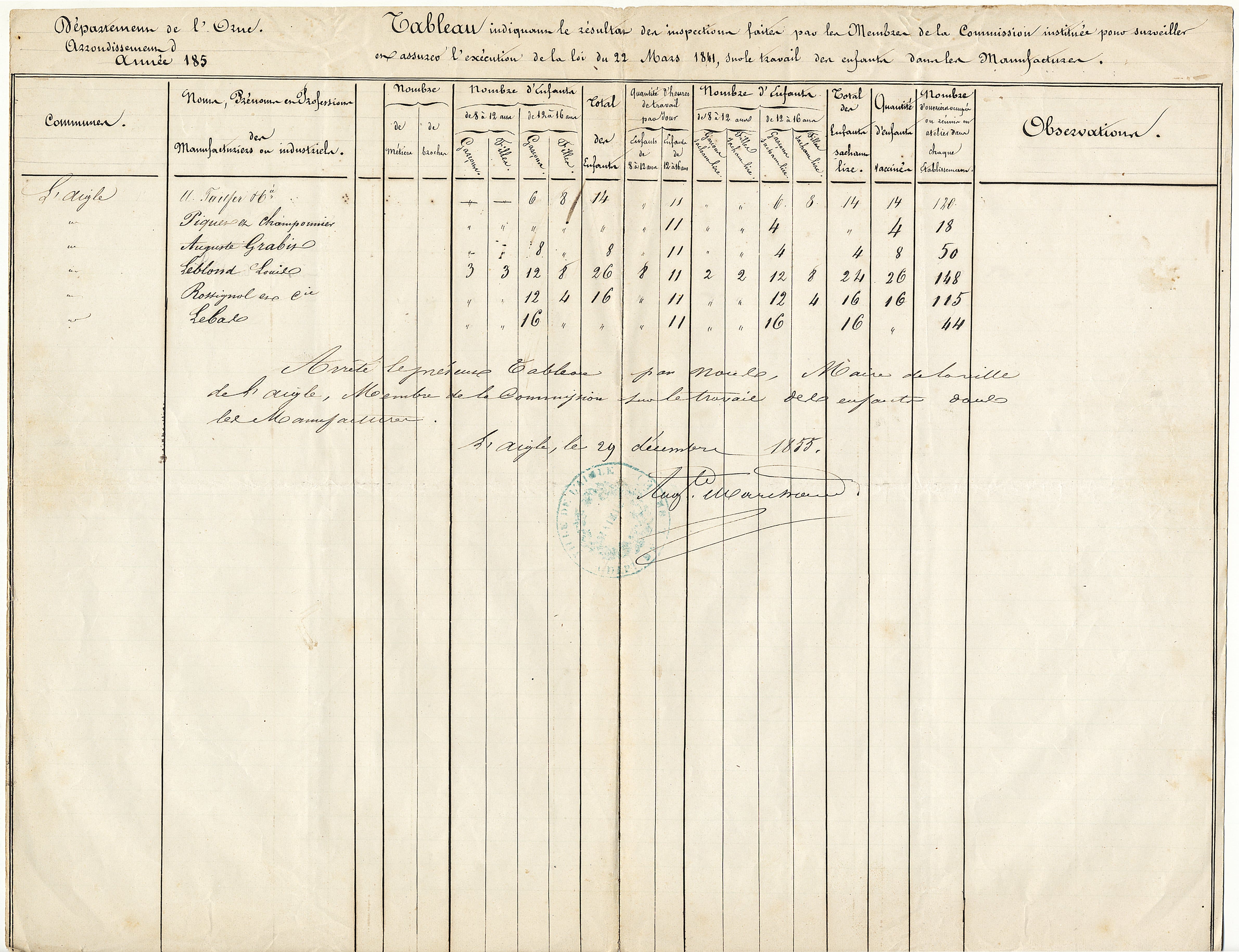 Le document présente le résultat de l’enquête annuelle réalisée en 1855 par la commission présidée par le maire de L’Aigle et transmise à la Préfecture. Il fait l’état des lieux du travail des enfants dans l’arrondissement de L’Aigle, conformément aux prescriptions de la loi de 1841.