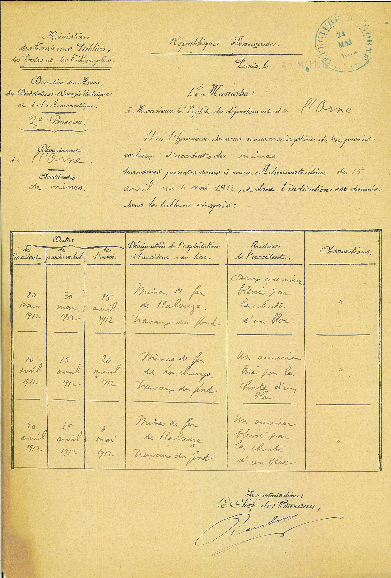 Le document présenté est un tableau récapitulatif réalisé par le Ministère des Travaux Publics qui recense les accidents survenus dans les mines de l’Orne entre le 10 mars et le 20 avril 1912. Sur cette courte période, on relève trois blessés et un tué, toujours dans les mêmes circonstances, à savoir la chute d’un bloc de minerai.
