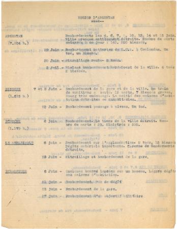 Ce document, issu des fonds de la préfecture, fait l'inventaire des attaques aériennes (bombardements, mitraillages) dans le département, commune par commune au cours du mois de juin 1944, en précisant les dégâts et le nombre de victimes civiles. Les attaques sont quotidiennes et visent essentiellement les gares, les voies ferrées et les routes.