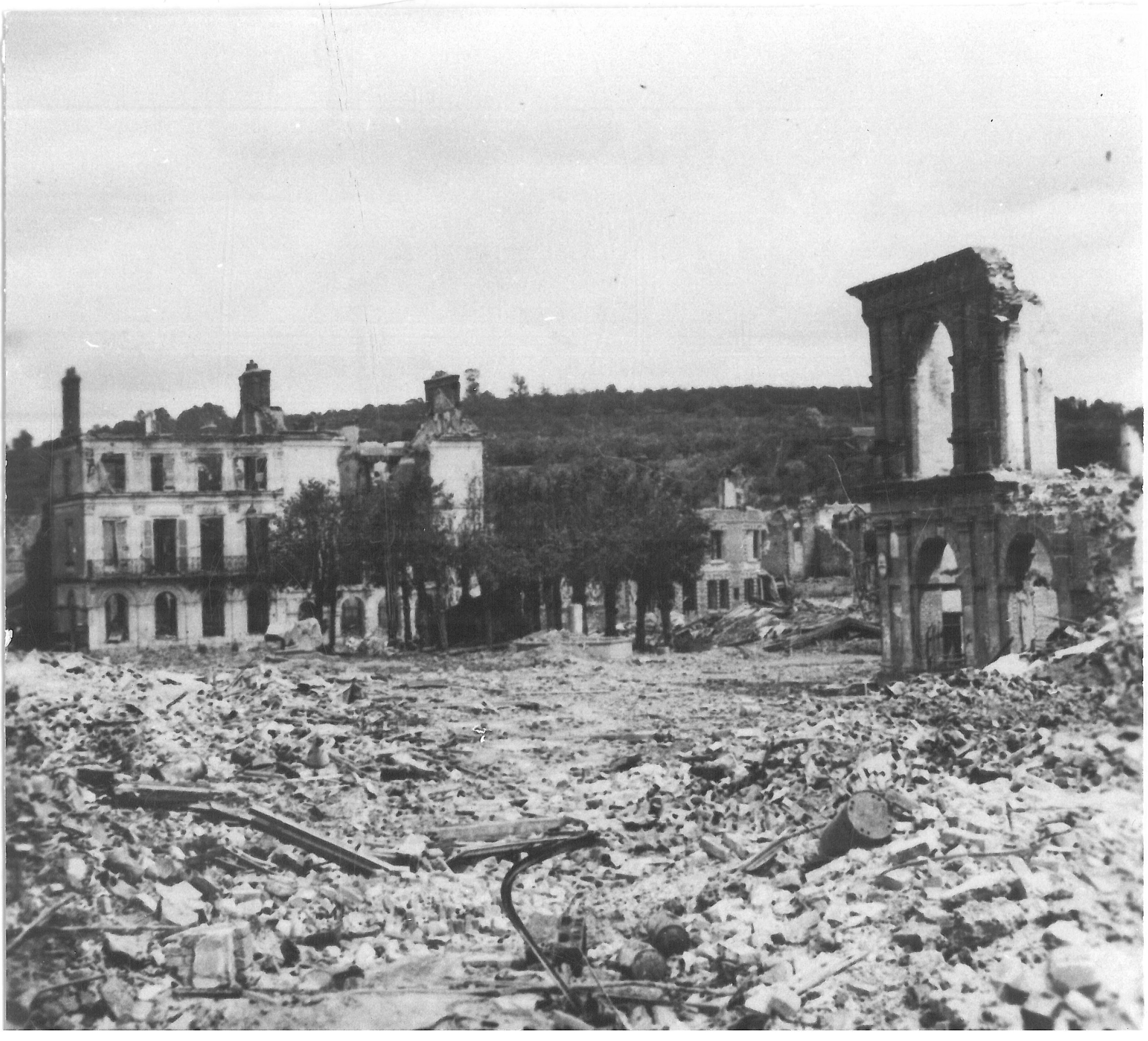 La photographie illustre de manière frappante la violence du bombardement du 14 juin. La place est couverte de ruines et de débris : sur la droite, on remarque quelques vestiges des halles. Au fond à gauche, le bâtiment de l’hôtel de ville est complètement dévasté.