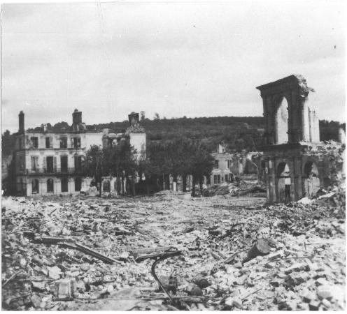 Les décombres de l'hôtel de ville et de la caisse d'Epargne après le bombardement du 14 juin