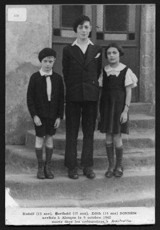 Nous avons reproduit ce document tel qu'il figure dans les fonds des Archives mais il nous faut préciser que les âges indiqués sur la légende ne correspondent pas à l'âge qu'avaient les enfants quand fut prise la photographie, mais à leur âge lors de leur décès. Ajoutons également qu'ils ne sont pas morts "dans les crématoires" : Edith et Rudolph ont très vraisemblablement été gazés dès leur arrivée, Rudolph est mort (d'épuisement ?) après quelques jours dans le camp.