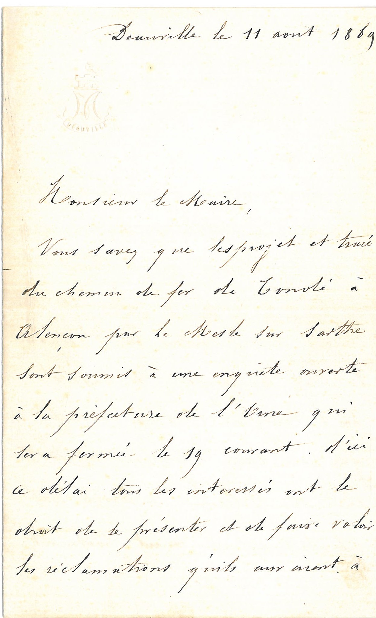 Ce n’est pas le cas du maire de Coulonges. Au contraire, il s’adresse à son collègue du Mesle-sur-Sarthe, situé à environ 5 km à l’Ouest, pour défendre un tracé qui permettrait d’installer la gare à proximité des routes desservant son village. Le comte de Coulonges a bien saisi les opportunités que la proximité de la gare offrirait à sa commune. Notons qu’il écrit de Deauville, au mois d’août ; peut-être y était-il en villégiature, ce qui indiquerait dans son mode de vie une forme de modernité qui lui a permis de mieux saisir l’intérêt de l’arrivée de la voie ferrée.